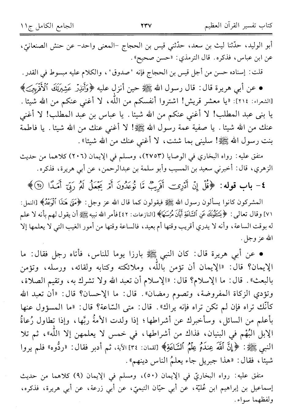 • عن أبي هريرة قال: كان النبي - صلى الله عليه وسلم - بارزا يوما للناس، فأتاه رجل فقال: ما الإيمان؟ قال: "الإيمان أن تؤمن بالله، وملائكته وكتابه ولقائه، ورسله، وتؤمن بالبعث". قال: ما الإسلام؟ قال: "الإسلام أن تعبد الله ولا تشرك به، وتقيم الصلاة، وتؤدي الزكاة المفروضة، وتصوم رمضان". قال: ما الإحسان؟ قال: "أن تعبد الله كأنّك تراه فإن لم تكن تراه فإنه يراك". قال: متى السّاعة؟ قال: "ما المسؤول عنها بأعلم من السائل، وسأخبرك عن أشراطها؛ إذا ولدت الأمةُ ربَّها، وإذا تطاول رُعاةُ الإبل البُهْم في البنيان، فذاك من أشراطها، في خمس لا يعلمهن إلا الله"، ثم تلا النبي - صلى الله عليه وسلم -: {إِنَّ اللَّهَ عِنْدَهُ عِلْمُ السَّاعَةِ} [لقمان: ٣٤] الآية، ثم أدبر فقال: "ردُّوه" فلم يروا شيئا، فقال: "هذا جبريل جاء يعلمُ الناس دينهم".