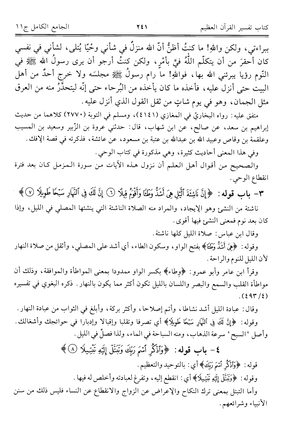٣ - باب قوله: {إِنَّ نَاشِئَةَ اللَّيْلِ هِيَ أَشَدُّ وَطْئًا وَأَقْوَمُ قِيلًا (٦) إِنَّ لَكَ فِي النَّهَارِ سَبْحًا طَوِيلًا (٧)}