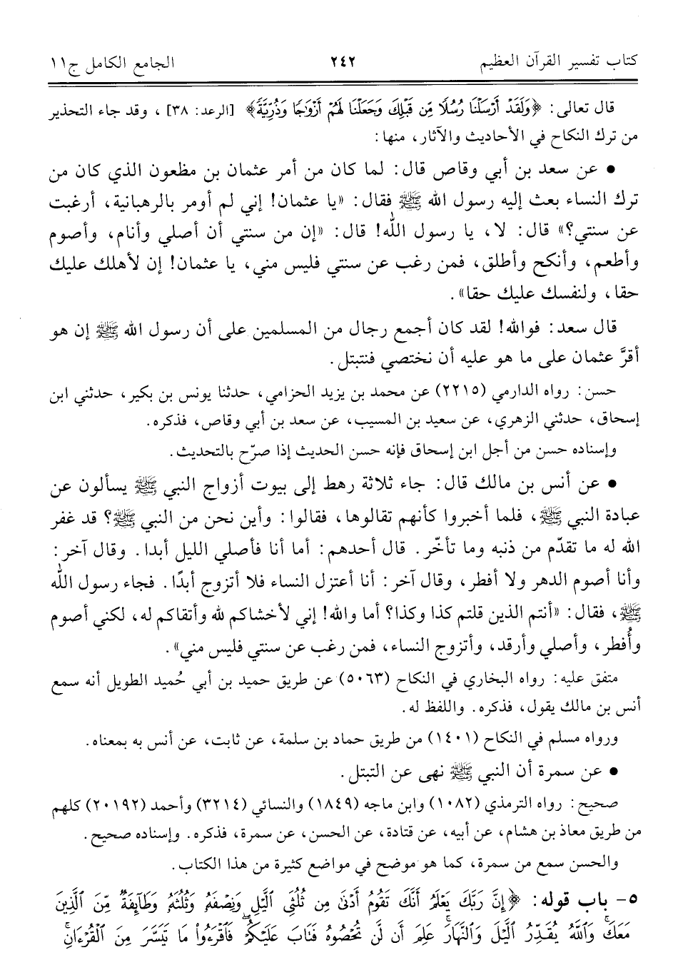 • عن سعد بن أبي وقاص قال: لما كان من أمر عثمان بن مظعون الذي كان من ترك النساء بعث إليه رسول الله - صلى الله عليه وسلم - فقال: "يا عثمان! إني لم أومر بالرهبانية، أرغبت عن سنتي؟ " قال: لا، يا رسول الله! قال: "إن من سنتي أن أصلي وأنام، وأصوم وأطعم، وأنكح وأطلق، فمن رغب عن سنتي فليس مني، يا عثمان! إن لأهلك عليك حقا، ولنفسك عليك حقا".