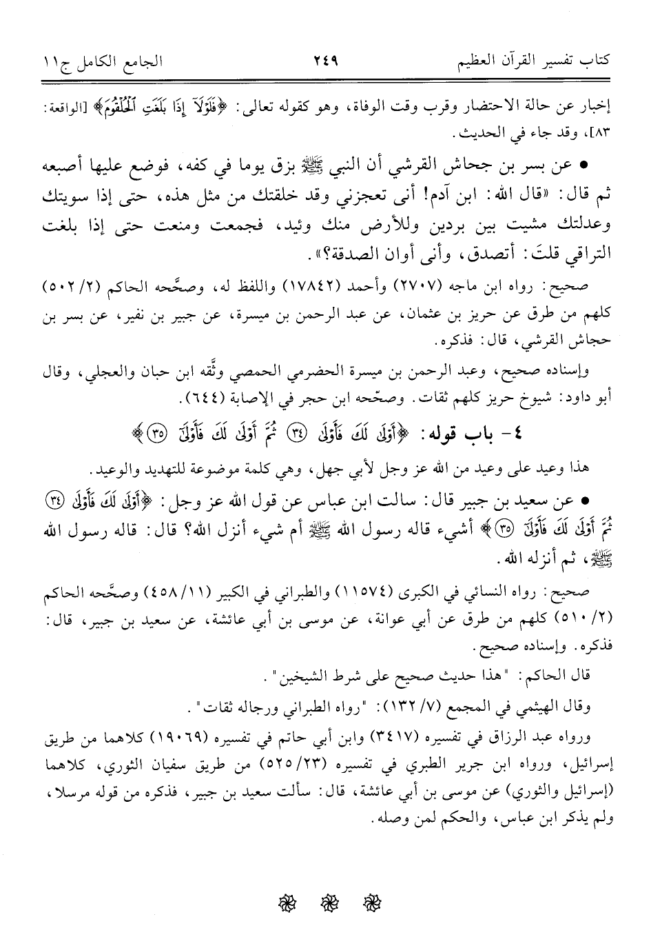 • عن سعيد بن جبير قال: سألت ابن عباس عن قول الله عز وجل: {أَوْلَى لَكَ فَأَوْلَى (٣٤) ثُمَّ أَوْلَى لَكَ فَأَوْلَى (٣٥)} أشيء قاله رسول الله - صلى الله عليه وسلم - أم شيء أنزل الله؟ قال: قاله رسول الله - صلى الله عليه وسلم -، ثم أنزله الله.