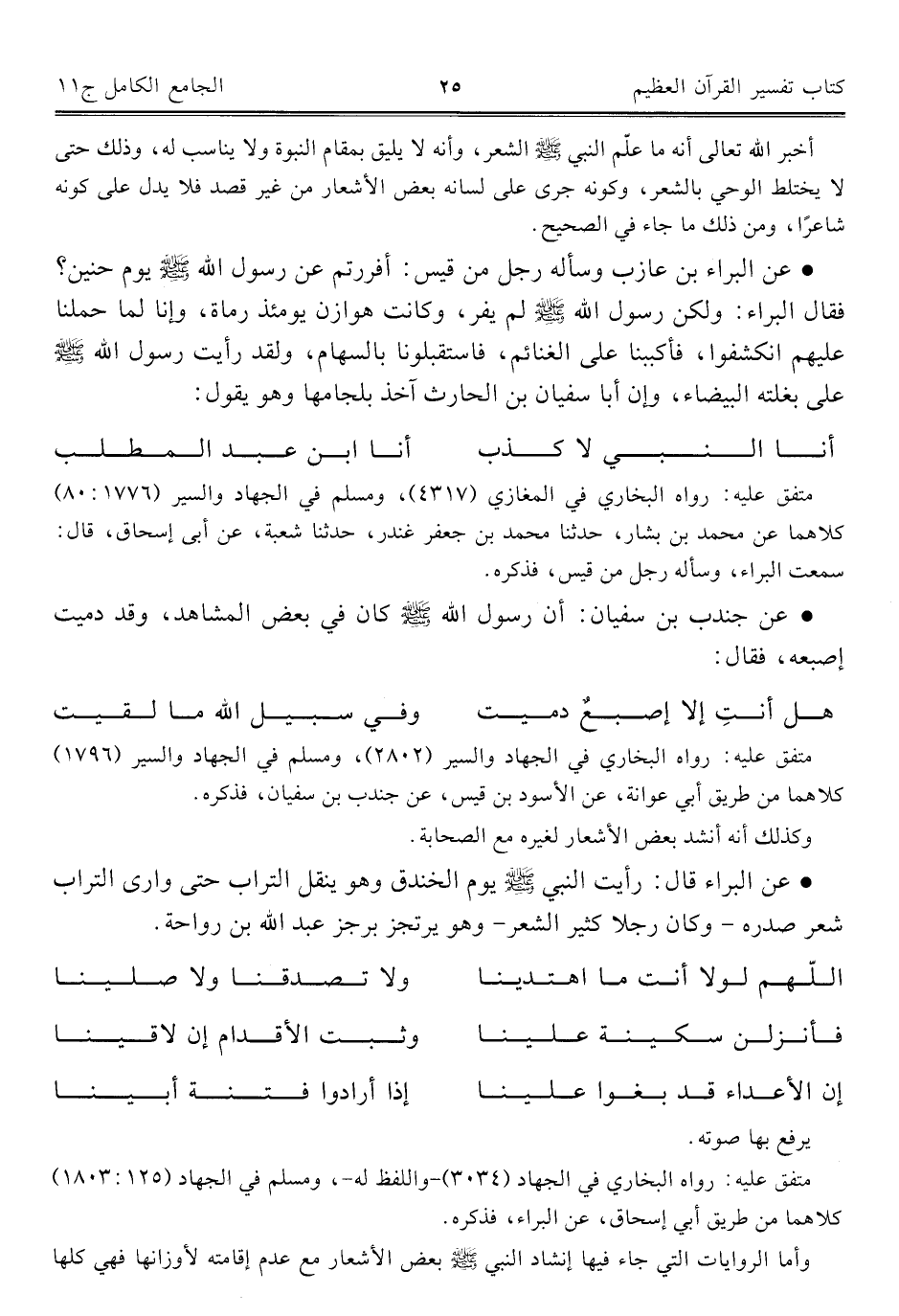 • عن البراء قال: رأيت النَّبِيّ - صلى الله عليه وسلم - يوم الخندق وهو ينقل التراب حتَّى وارى التراب شعر صدره - وكان رجلًا كثير الشعر - وهو يرتجز برجز عبد الله بن رواحة.