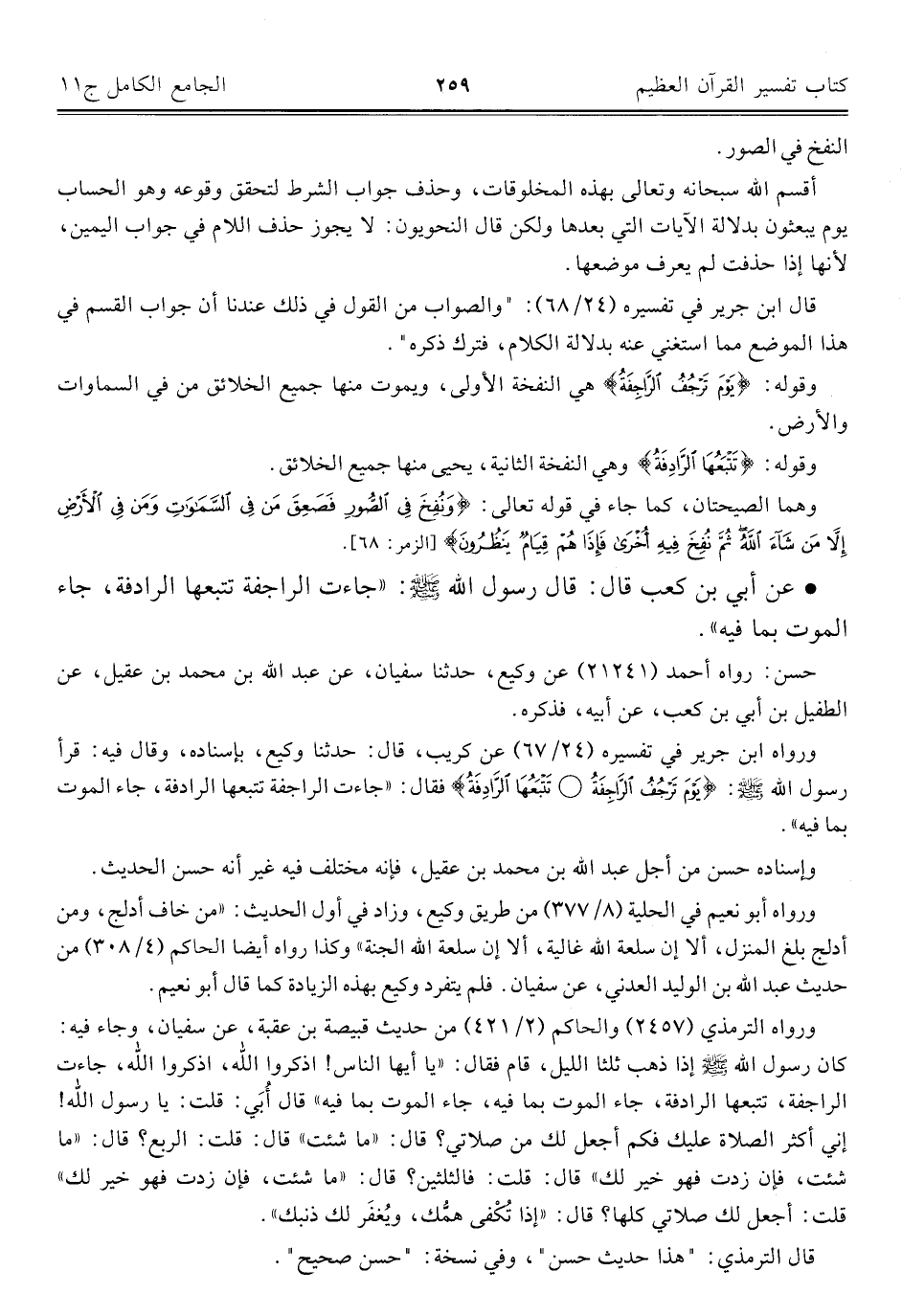 ورواه ابن جرير في تفسيره (٢٤/ ٦٧) عن كريب، قال: حدثنا وكيع، بإسناده، وقال فيه: قرأ رسول الله - صلى الله عليه وسلم -: {يَوْمَ تَرْجُفُ الرَّاجِفَةُ (٦) تَتْبَعُهَا الرَّادِفَةُ} فقال: "جاءت الراجفة تتبعها الرادفة، جاء الموت بما فيه".
