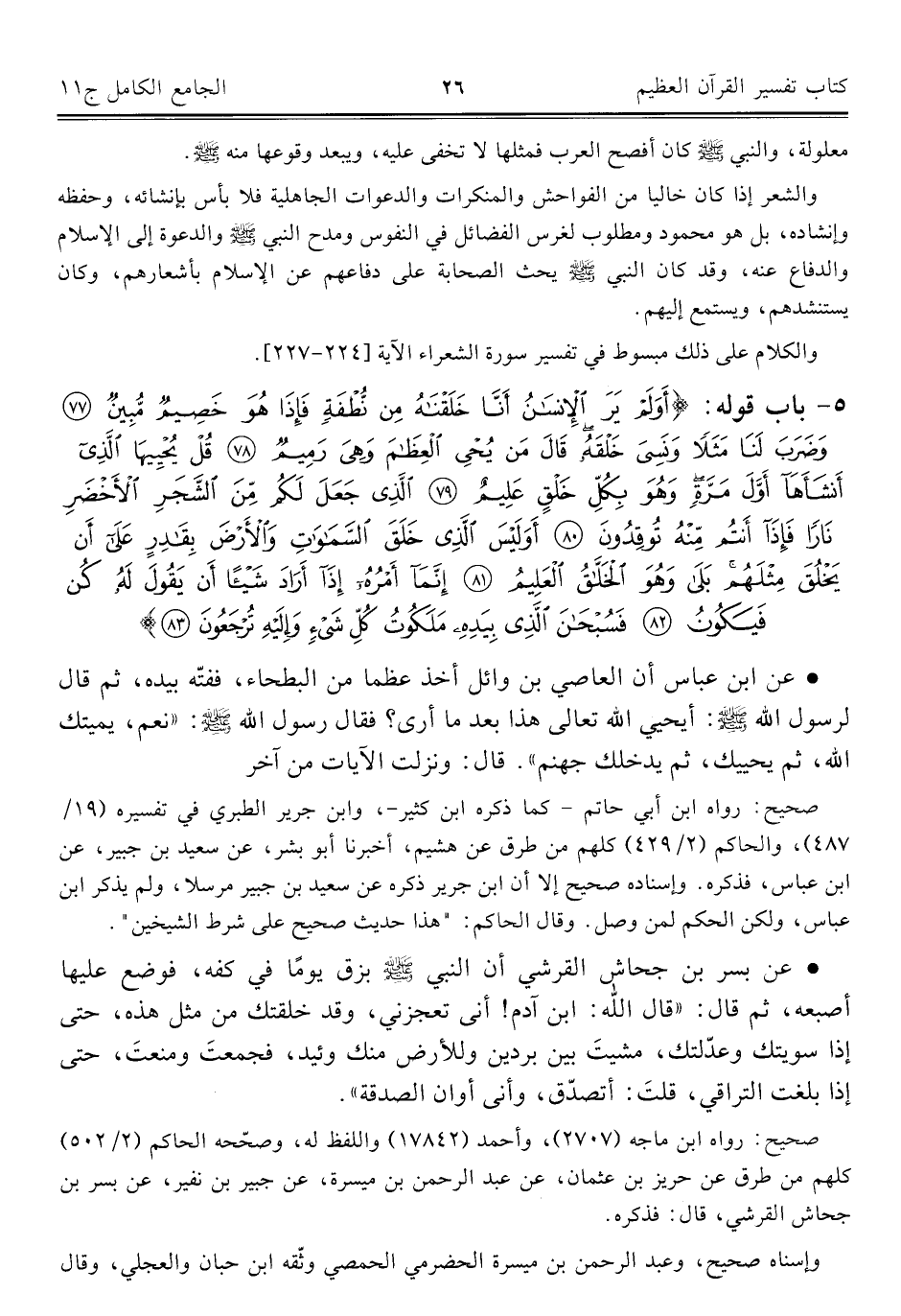 • عن ابن عباس أن العاصي بن وائل أخذ عظما من البطحاء، ففتّه بيده، ثمّ قال لرسول الله - صلى الله عليه وسلم -: أيحيي الله تعالى هذا بعد ما أرى؟ فقال رسول الله - صلى الله عليه وسلم -: "نعم، يميتك الله، ثمّ يحييك، ثمّ يدخلك جهنّم". قال: ونزلت الآيات من آخر.