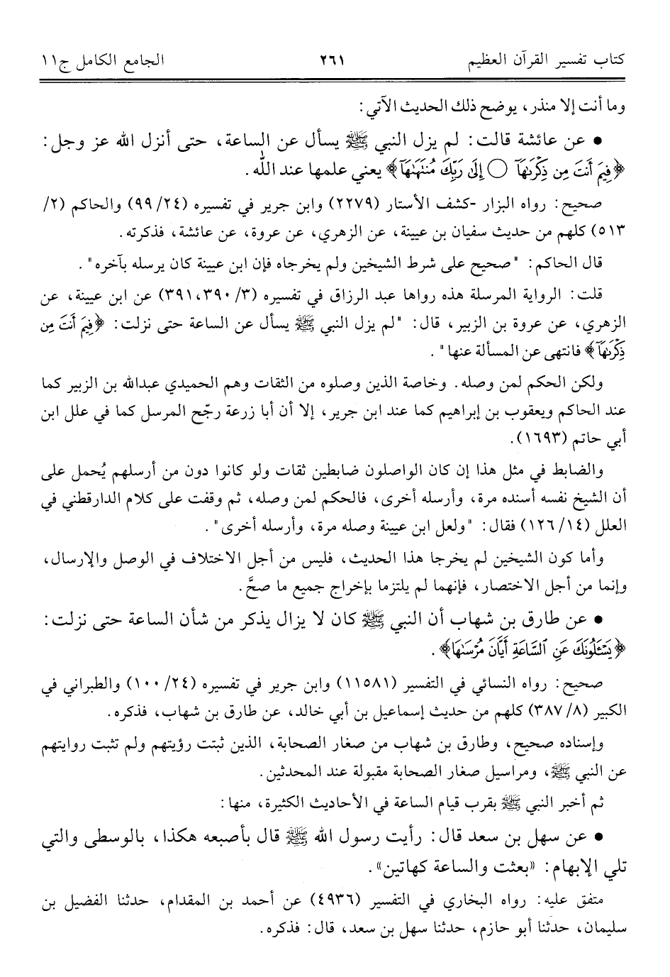 • عن عائشة قالت: لم يزل النبي - صلى الله عليه وسلم - يسأل عن الساعة، حتى أنزل الله عز وجل: {فِيمَ أَنْتَ مِنْ ذِكْرَاهَا (٤٣) إِلَى رَبِّكَ مُنْتَهَاهَا} يعني علمها عند الله.