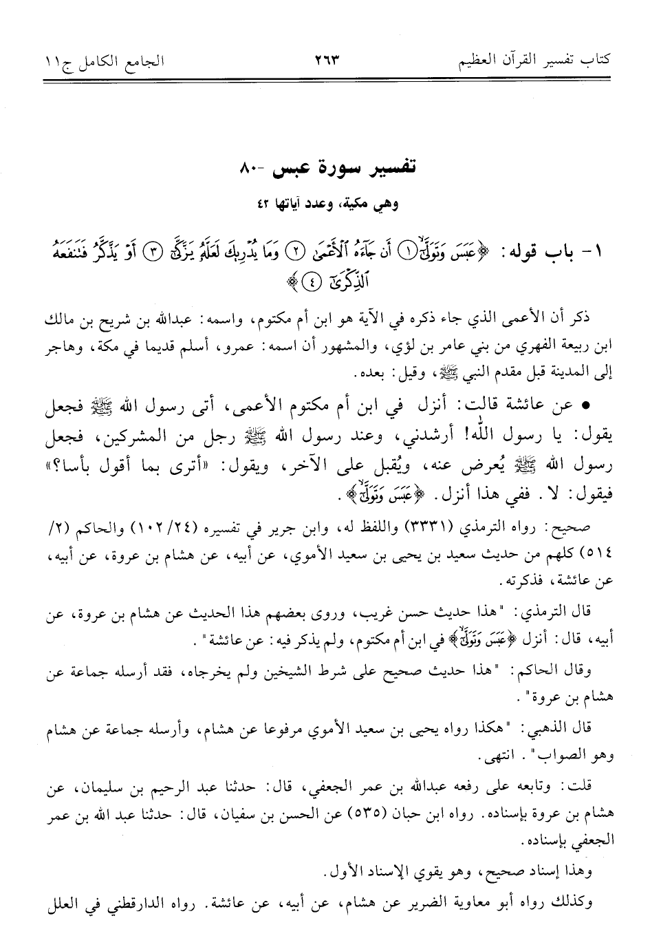 قال الترمذي: "هذا حديث حسن غريب، وروى بعضهم هذا الحديث عن هشام بن عروة، عن أبيه، قال: أنزل {عَبَسَ وَتَوَلَّى} في ابن أم مكتوم، ولم يذكر فيه: عن عائشة".