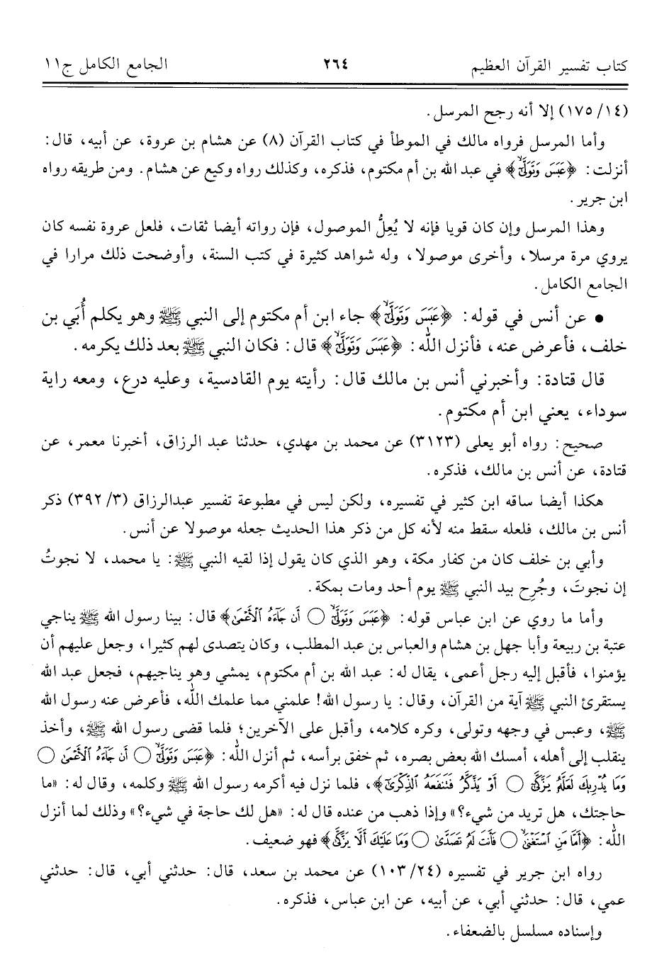 وأما المرسل فرواه مالك في الموطأ في كتاب القرآن (٨) عن هشام بن عروة، عن أبيه، قال: أنزلت: {عَبَسَ وَتَوَلَّى} في عبد الله بن أم مكتوم، فذكره، وكذلك رواه وكيع عن هشام. ومن طريقه رواه ابن جرير.