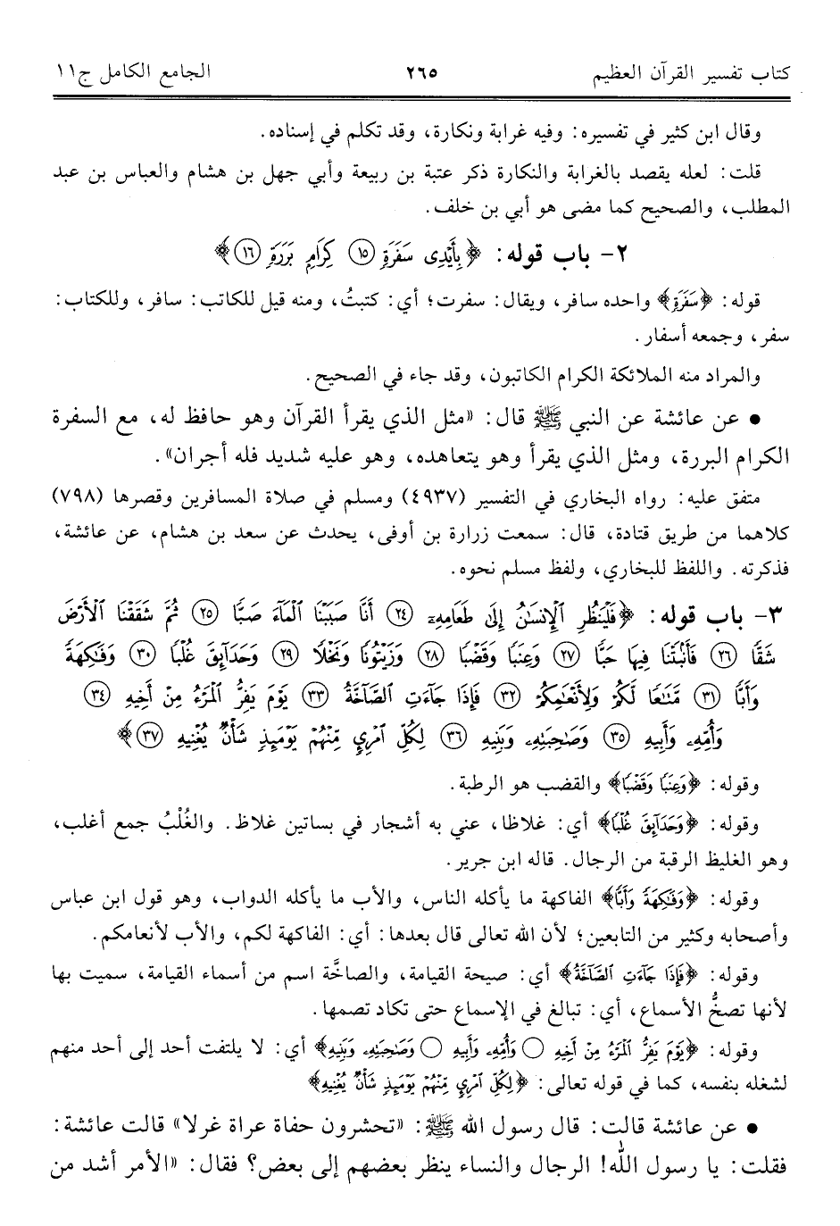 ٣ - باب قوله: {فَلْيَنْظُرِ الْإِنْسَانُ إِلَى طَعَامِهِ (٢٤) أَنَّا صَبَبْنَا الْمَاءَ صَبًّا (٢٥) ثُمَّ شَقَقْنَا الْأَرْضَ شَقًّا (٢٦) فَأَنْبَتْنَا فِيهَا حَبًّا (٢٧) وَعِنَبًا وَقَضْبًا (٢٨) وَزَيْتُونًا وَنَخْلًا (٢٩) وَحَدَائِقَ غُلْبًا (٣٠) وَفَاكِهَةً وَأَبًّا (٣١) مَتَاعًا لَكُمْ وَلِأَنْعَامِكُمْ (٣٢) فَإِذَا جَاءَتِ الصَّاخَّةُ (٣٣) يَوْمَ يَفِرُّ الْمَرْءُ مِنْ أَخِيهِ (٣٤) وَأُمِّهِ وَأَبِيهِ (٣٥) وَصَاحِبَتِهِ وَبَنِيهِ (٣٦) لِكُلِّ امْرِئٍ مِنْهُمْ يَوْمَئِذٍ شَأْنٌ يُغْنِيهِ (٣٧)}