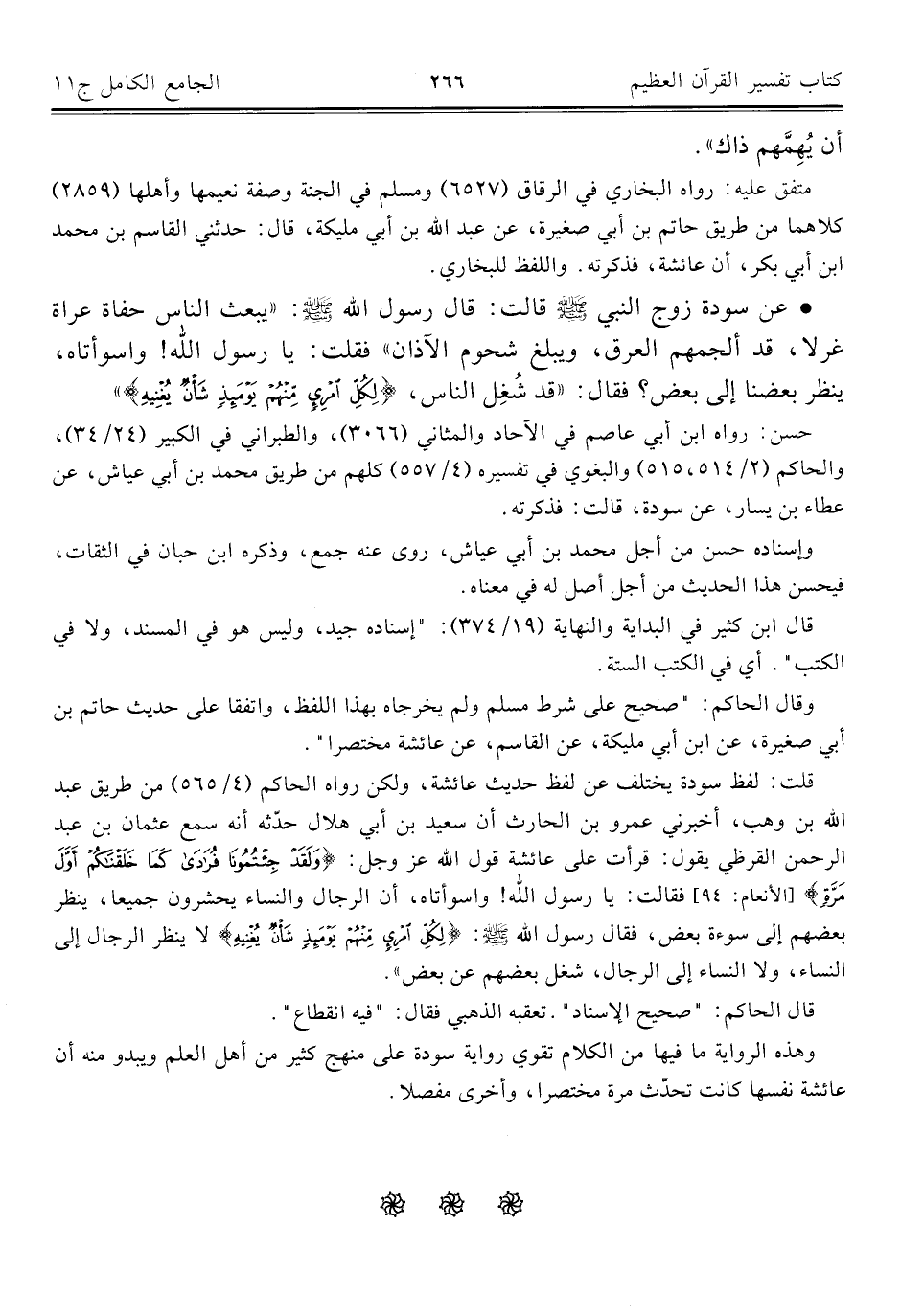 قلت: لفظ سودة يختلف عن لفظ حديث عائشة، ولكن رواه الحاكم (٤/ ٥٦٥) من طريق عبد الله بن وهب، أخبرني عمرو بن الحارث أن سعيد بن أبي هلال حدّثه أنه سمع عثمان بن عبد الرحمن القرظي يقول: قرأت على عائشة قول الله عز وجل: {وَلَقَدْ جِئْتُمُونَا فُرَادَى كَمَا خَلَقْنَاكُمْ أَوَّلَ مَرَّةٍ} [الأنعام: ٩٤] فقالت: يا رسول الله! واسوأتاه، أن الرجال والنساء يحشرون جميعا، ينظر بعضهم إلى سوءة بعض، فقال رسول الله - صلى الله عليه وسلم -: {لِكُلِّ امْرِئٍ مِنْهُمْ يَوْمَئِذٍ شَأْنٌ يُغْنِيهِ} لا ينظر الرجال إلى النساء، ولا النساء إلى الرجال، شغل بعضهم عن بعض".