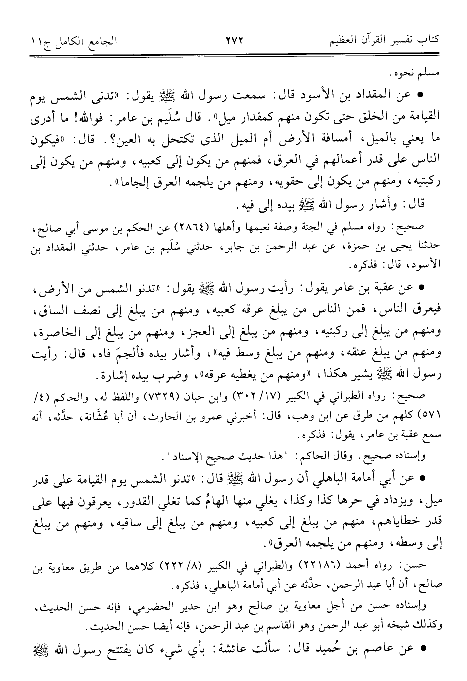 • عن عقبة بن عامر يقول: رأيت رسول الله - صلى الله عليه وسلم - يقول: "تدنو الشمس من الأرض، فيعرق الناس، فمن الناس من يبلغ عرقه كعبيه، ومنهم من يبلغ إلى نصف الساق، ومنهم من يبلغ إلى ركبتيه، ومنهم من يبلغ إلى العجز، ومنهم من يبلغ إلى الخاصرة، ومنهم من يبلغ عنقه، ومنهم من يبلغ وسط فيه"، وأشار بيده فألجمَ فاه، قال: رأيت رسول الله - صلى الله عليه وسلم - يشير هكذا، "ومنهم من يغطيه عرقه"، وضرب بيده إشارة.