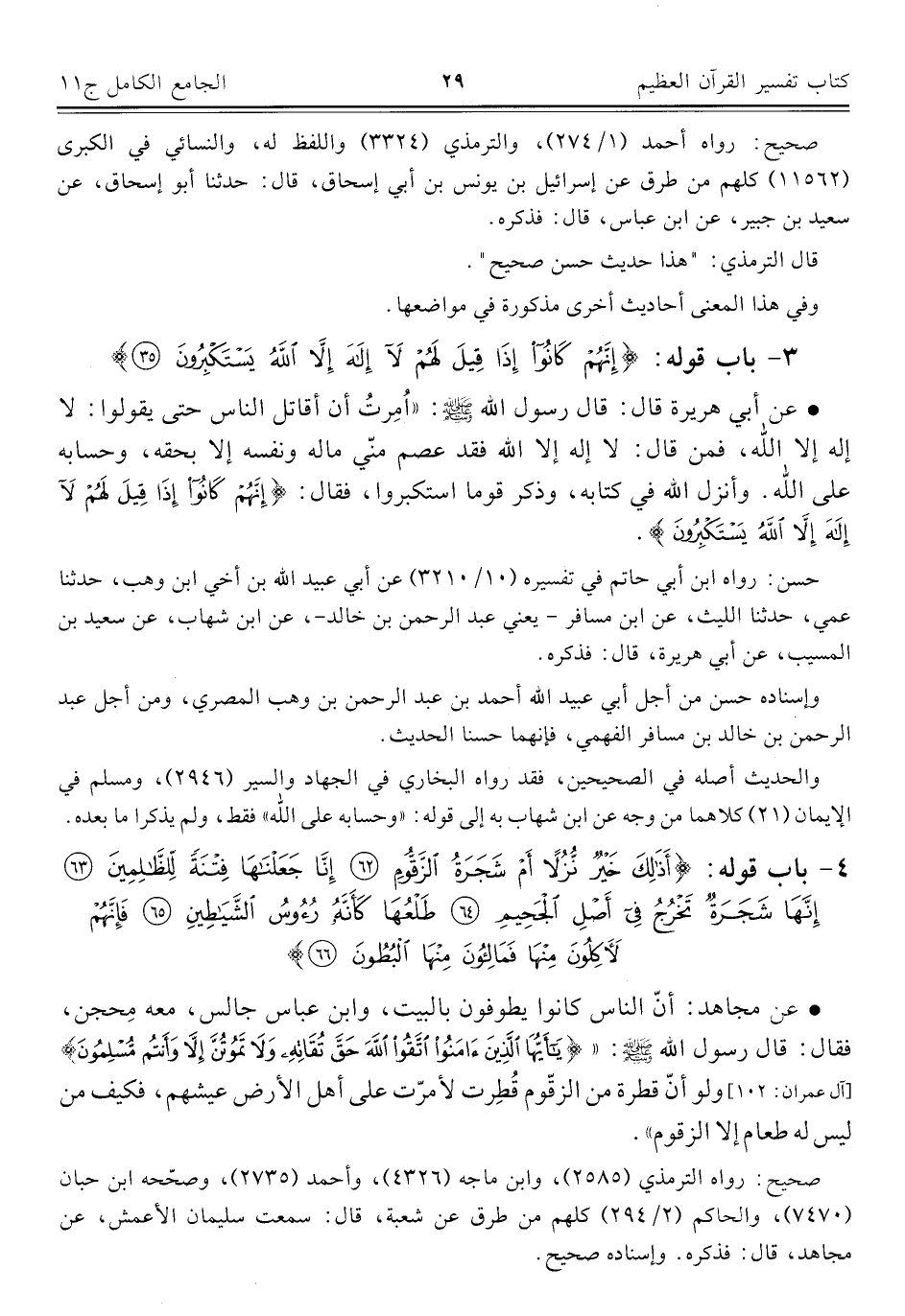 • عن أبي هريرة قال: قال رسول الله - صلى الله عليه وسلم -: "اُمِرتُ أن أقاتل الناس حتَّى يقولوا: لا إله إِلَّا الله، فمن قال: لا إله إِلَّا الله فقد عصم منّي ماله ونفسه إِلَّا بحقه، وحسابه على الله. وأنزل الله في كتابه، وذكر قومًا استكبروا، فقال: {إِنَّهُمْ كَانُوا إِذَا قِيلَ لَهُمْ لَا إِلَهَ إِلَّا اللَّهُ يَسْتَكْبِرُونَ}.