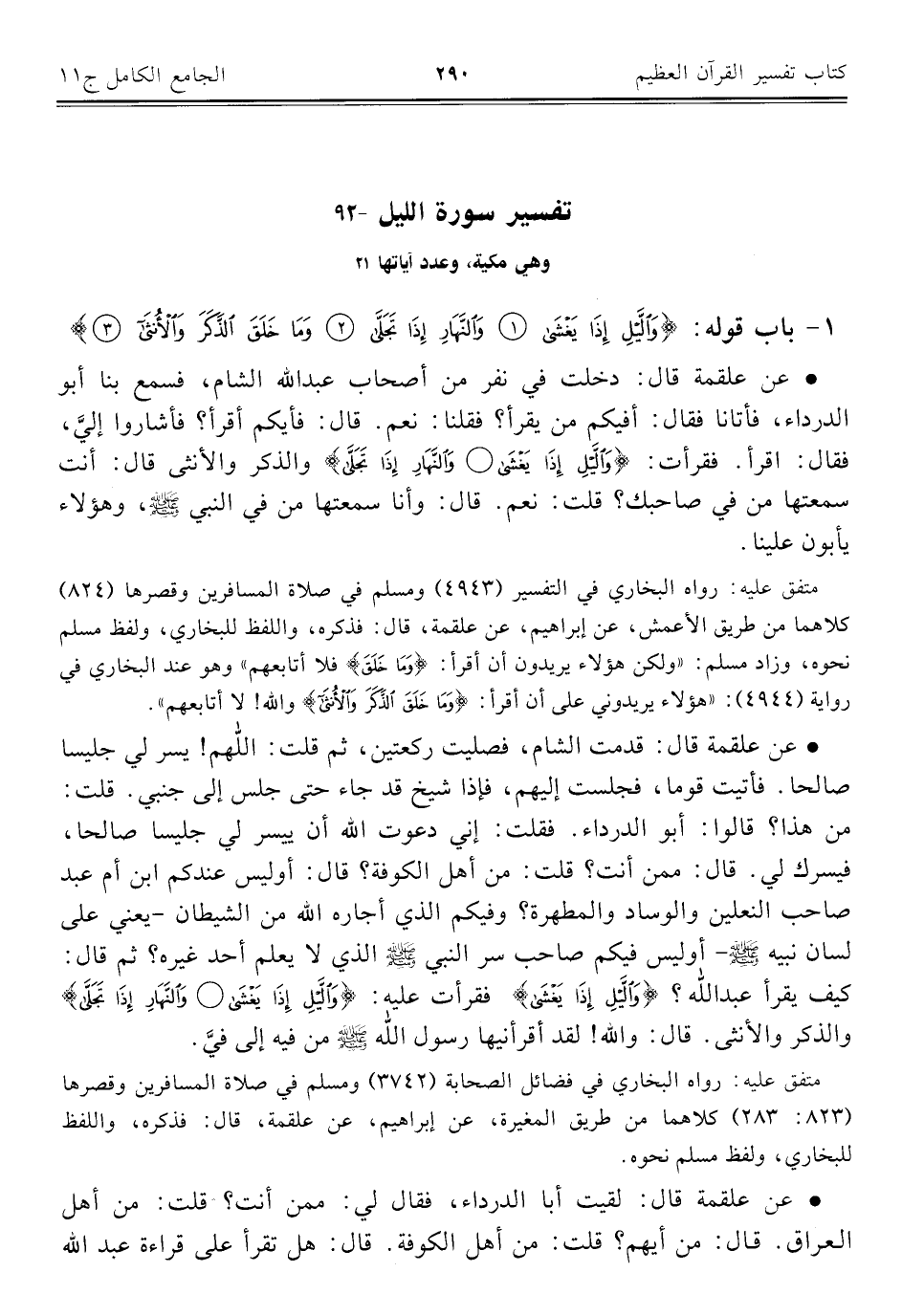 • عن علقمة قال: دخلت في نفر من أصحاب عبد الله الشام، فسمع بنا أبو الدرداء، فأتانا فقال: أفيكم من يقرأ؟ فقلنا: نعم. قال: فأيكم أقرأ؟ فأشاروا إليَّ، فقال: اقرأ. فقرأت: {وَاللَّيْلِ إِذَا يَغْشَى (١) وَالنَّهَارِ إِذَا تَجَلَّى} والذكر والأنثى قال: أنت سمعتها من في صاحبك؟ قلت: نعم. قال: وأنا سمعتها من في النبي - صلى الله عليه وسلم -، وهؤلاء يأبون علينا.