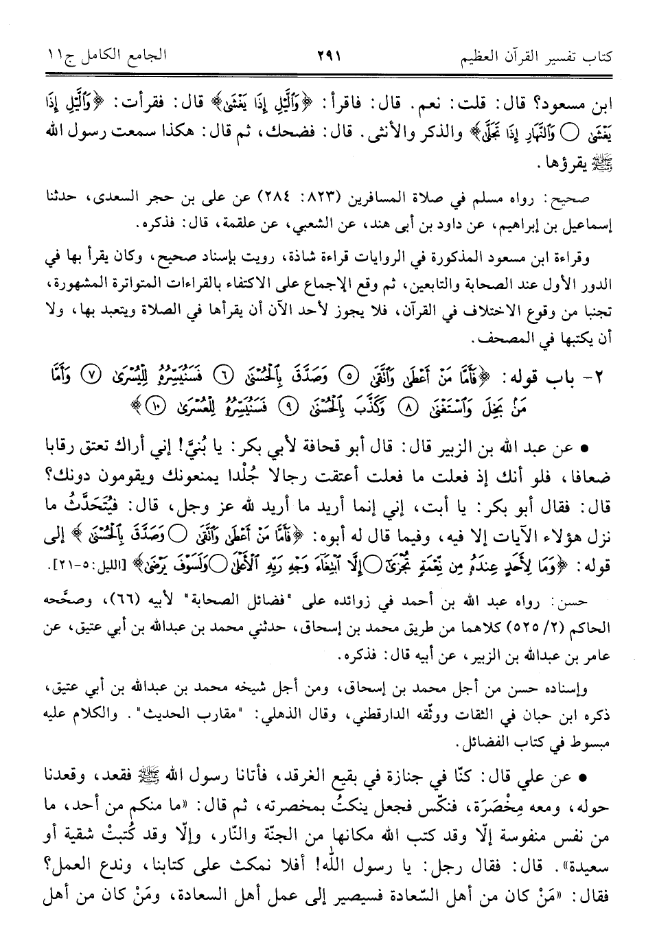 ابن مسعود؟ قال؟ قلت: نعم. قال: فاقرأ؟ {وَاللَّيْلِ إِذَا يَغْشَى} قال: فقرأت: {وَاللَّيْلِ إِذَا يَغْشَى (١) وَالنَّهَارِ إِذَا تَجَلَّى} والذكر والأنثى. قال: فضحك، ثم قال: هكذا سمعت رسول الله - صلى الله عليه وسلم - يقرؤها.