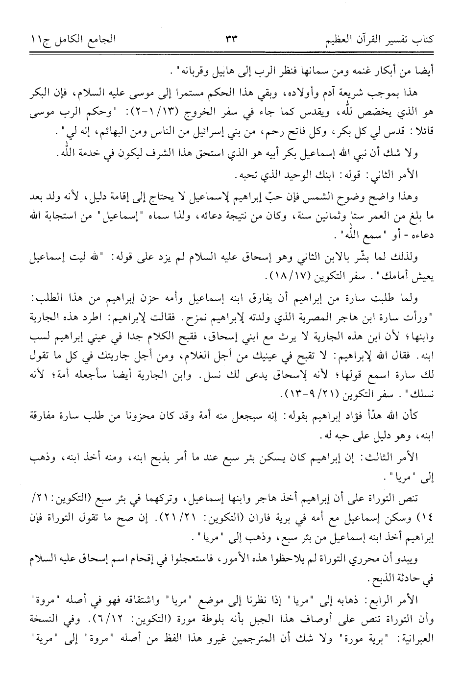 الأمر الرابع: ذهابه إلى "مريا" إذا نظرنا إلى موضع "مريا" واشتقاقه فهو في أصله "مروة" وأن التوراة تنص على أوصاف هذا الجبل بأنه بلوطة مورة (التكوين: ١٢/ ٦). وفي النسخة العبرانية: "برية مورة" ولا شك أن المترجمين غيرو هذا الفظ من أصله "مروة" إلى "مرية"