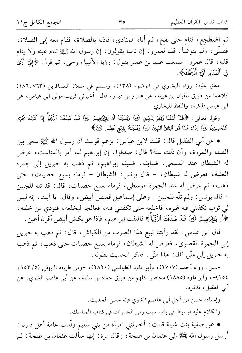 • عن أبي الطفيل قال: قلت لابن عباس: يزعم قومك أن رسول الله - صلى الله عليه وسلم - سعى بين الصفا والمروة، وأن ذلك سنة؟ قال: صدقوا، إن إبراهيم لما أمر بالمناسك، عرض له الشّيطان عند المسعى، فسابقه، فسبقه إبراهيم، ثمّ ذهب به جبريل إلى جمرة العقبة، فعرض له شيطان، - قال يونس: الشّيطان - فرماه بسبع حصيات، حتَّى ذهب، ثمّ عرض له عند الجمرة الوسطى، فرماه بسبع حصيات، قال: قد تله للجبين - قال يونس: وثم تلّه للجبين - وعلى إسماعيل قميص أبيض، وقال: يا أبت، إنه ليس لي ثوب تكفنني فيه غيره، فاخلعه حتَّى تكفنني فيه، فعالجه ليخلعه، فنودي من خلفه: {أَنْ يَاإِبْرَاهِيمُ (١٠٤) قَدْ صَدَّقْتَ الرُّؤْيَا} فالتفت إبراهيم، فإذا هو بكبش أبيض أقرن أعين.