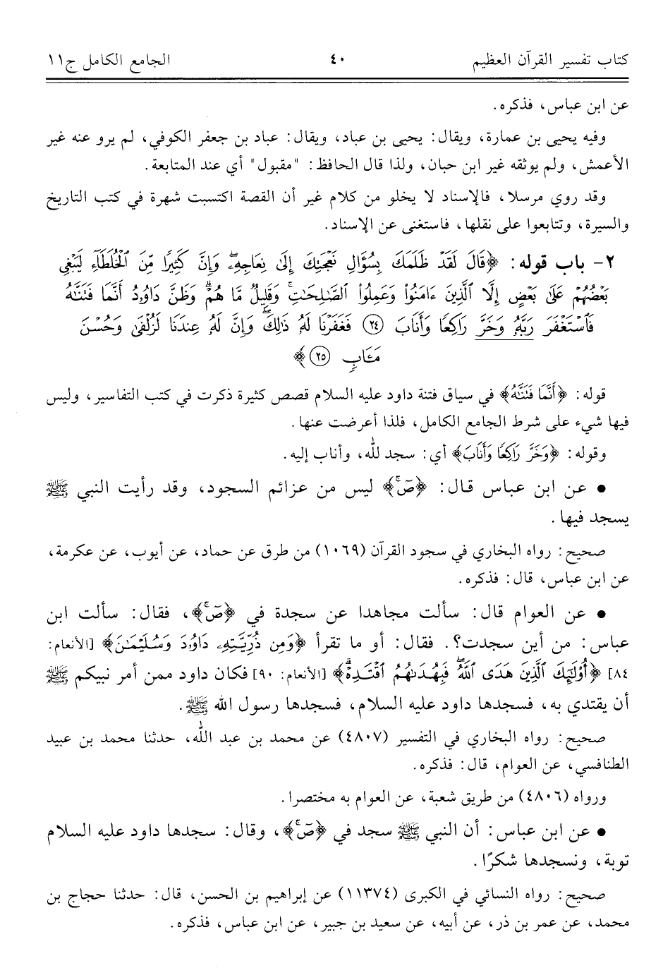 • عن ابن عباس قال: {ص} ليس من عزائم السجود، وقد رأيت النَّبِيّ - صلى الله عليه وسلم - يسجد فيها.