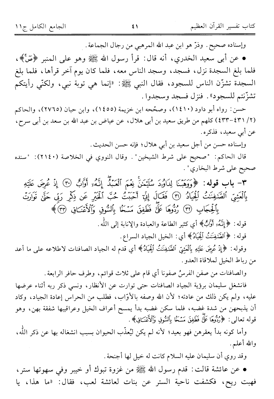 ٣ - باب قوله: {وَوَهَبْنَا لِدَاوُودَ سُلَيْمَانَ نِعْمَ الْعَبْدُ إِنَّهُ أَوَّابٌ (٣٠) إِذْ عُرِضَ عَلَيْهِ بِالْعَشِيِّ الصَّافِنَاتُ الْجِيَادُ (٣١) فَقَالَ إِنِّي أَحْبَبْتُ حُبَّ الْخَيْرِ عَنْ ذِكْرِ رَبِّي حَتَّى تَوَارَتْ بِالْحِجَابِ (٣٢) رُدُّوهَا عَلَيَّ فَطَفِقَ مَسْحًا بِالسُّوقِ وَالْأَعْنَاقِ (٣٣)}