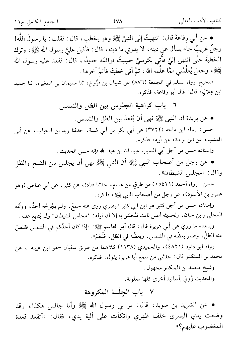 • عن رجل من أصحاب النبي - صلى الله عليه وسلم - أن النبي - صلى الله عليه وسلم - نهى أن يجلس بين الضح والظل وقال: "مجلس الشيطان".