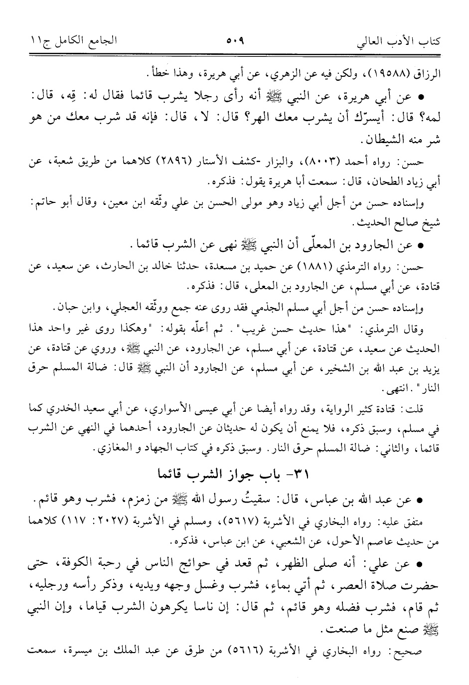 • عن الجارود بن المعلّى أن النبي - صلى الله عليه وسلم - نهى عن الشرب قائما.