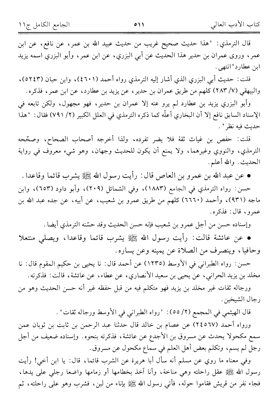 • عن عبد الله بن عمرو بن العاص قال: رأيت رسول الله - صلى الله عليه وسلم - يشرب قائما وقاعدا.