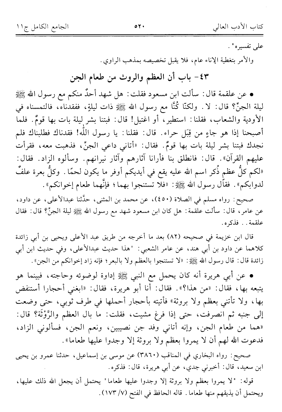 • عن علقمة قال: سألت ابن مسعود فقلت: هل شهد أحدٌ منكم مع رسول الله - صلى الله عليه وسلم - ليلة الجنِّ؟ قال: لا. ولكنّا كُنَّا مع رسول الله - صلى الله عليه وسلم - ذات ليلةٍ، ففقدناه، فالتمسناه في الأودية والشعاب، فقلنا: استطير، أو اغتيل! قال: فبتنا بشر ليلة بات بها قومٌ. فلما أصبحنا إذا هو جاءٍ من قِبَل حراء. قال: فقلنا: يا رسول الله! فقدناك فطلبناك فلم نجدك فبتنا بشر ليلة بات بها قومٌ. فقال: "أتاني داعي الجنِّ، فذهبت معه، فقرأت عليهم القرآن". قال: فانطلق بنا فأرانا آثارهم وآثار نيرانهم. وسألوه الزاد. فقال: "لكم كلُّ عظمٍ ذُكر اسم الله عليه يقع في أيديكم أوفر ما يكون لحمًا. وكلُّ بعرة علفٌ لدوابكم". فقال رسول الله - صلى الله عليه وسلم -: "فلا تستنجوا بهما؛ فإنَّهما طعام إخوانكم".