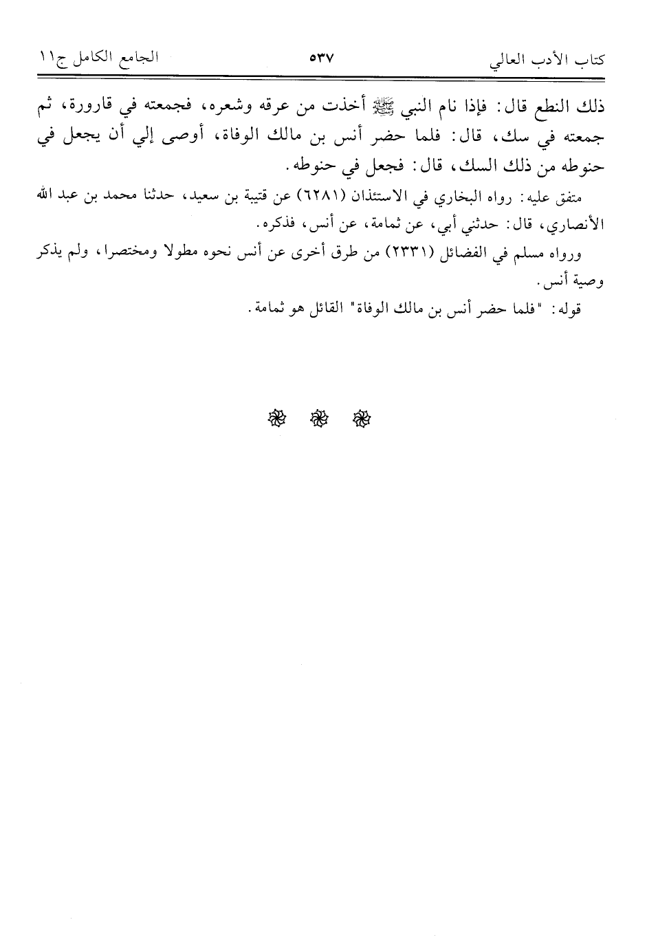 ذلك النطع قال: فإذا نام النبي - صلى الله عليه وسلم - أخذت من عرقه وشعره، فجمعته في قارورة، ثم جمعته في سك، قال: فلما حضر أنس بن مالك الوفاة، أوصى إلي أن يجعل في حنوطه من ذلك السك، قال: فجعل في حنوطه.