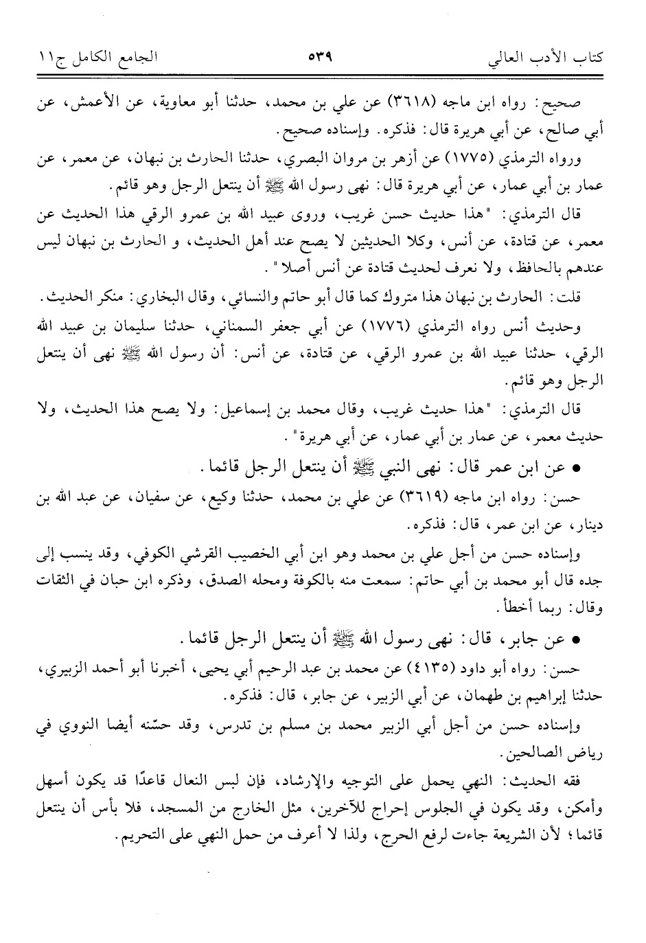 ورواه الترمذي (١٧٧٥) عن أزهر بن مروان البصري، حدثنا الحارث بن نبهان، عن معمر، عن عمار بن أبي عمار، عن أبي هريرة قال: نهى رسول الله - صلى الله عليه وسلم - أن ينتعل الرجل وهو قائم.