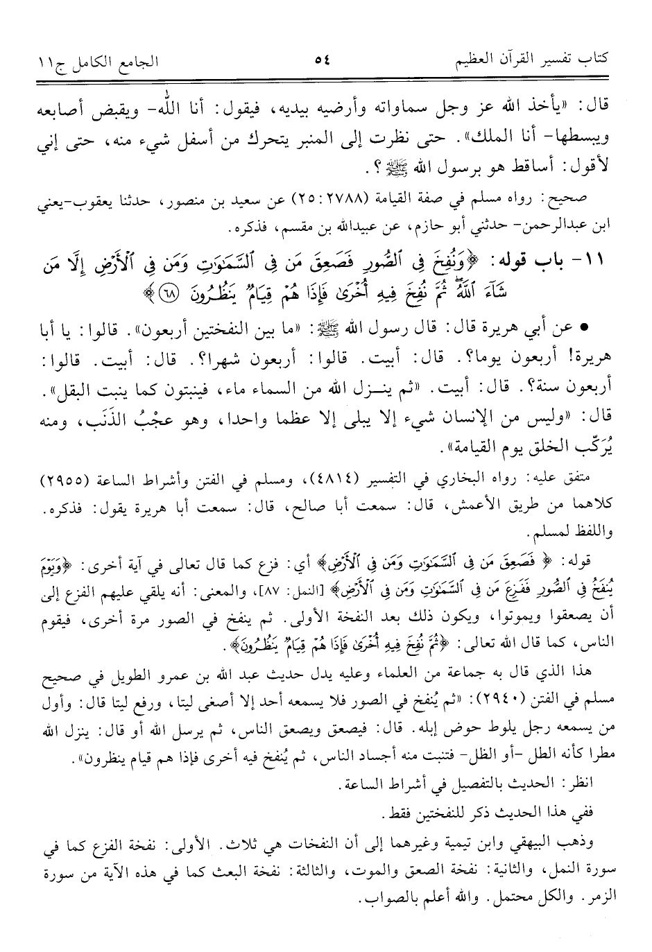 ١١ - باب قوله: {وَنُفِخَ فِي الصُّورِ فَصَعِقَ مَنْ فِي السَّمَاوَاتِ وَمَنْ فِي الْأَرْضِ إِلَّا مَنْ شَاءَ اللَّهُ ثُمَّ نُفِخَ فِيهِ أُخْرَى فَإِذَا هُمْ قِيَامٌ يَنْظُرُونَ (٦٨)}