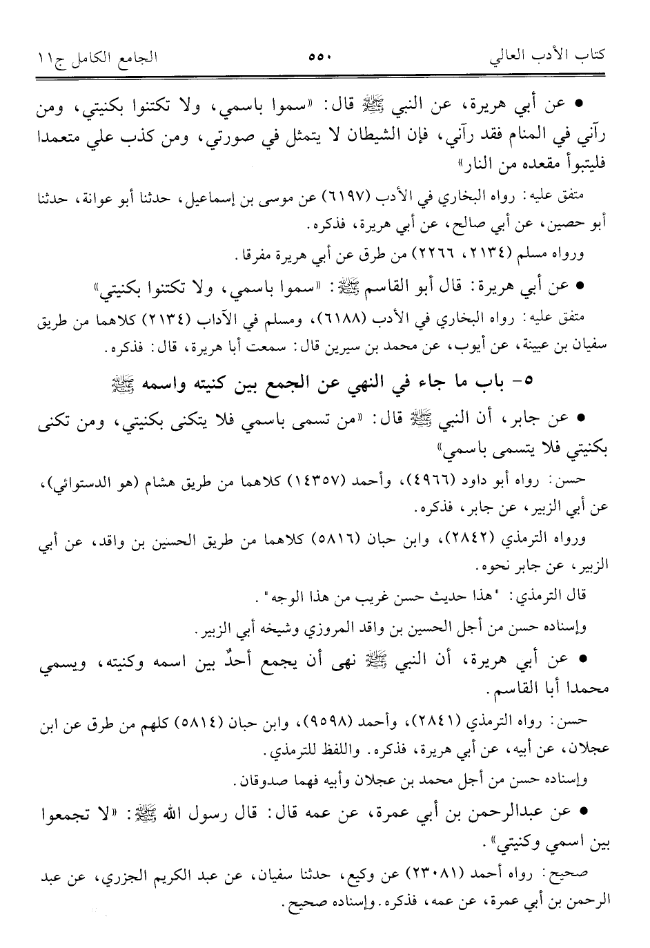 • عن أبي هريرة، أن النبي - صلى الله عليه وسلم - نهى أن يجمع أحدٌ بين اسمه وكنيته، ويسمي محمدا أبا القاسم.
