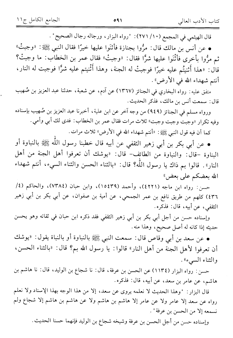 • عن أبي بكر بن أبي زهير الثقفي عن أبيه قال خطبنا رسول الله - صلى الله عليه وسلم - بالنباوة أو البناوة - قال: والنباوة من الطائف - قال: "يوشك أن تعرفوا أهل الجنة من أهل النار". قالوا بم ذاك يا رسول الله؟ قال: "بالثناء الحسن والثناء السيء، أنتم شهداء الله بعضكم على بعض".