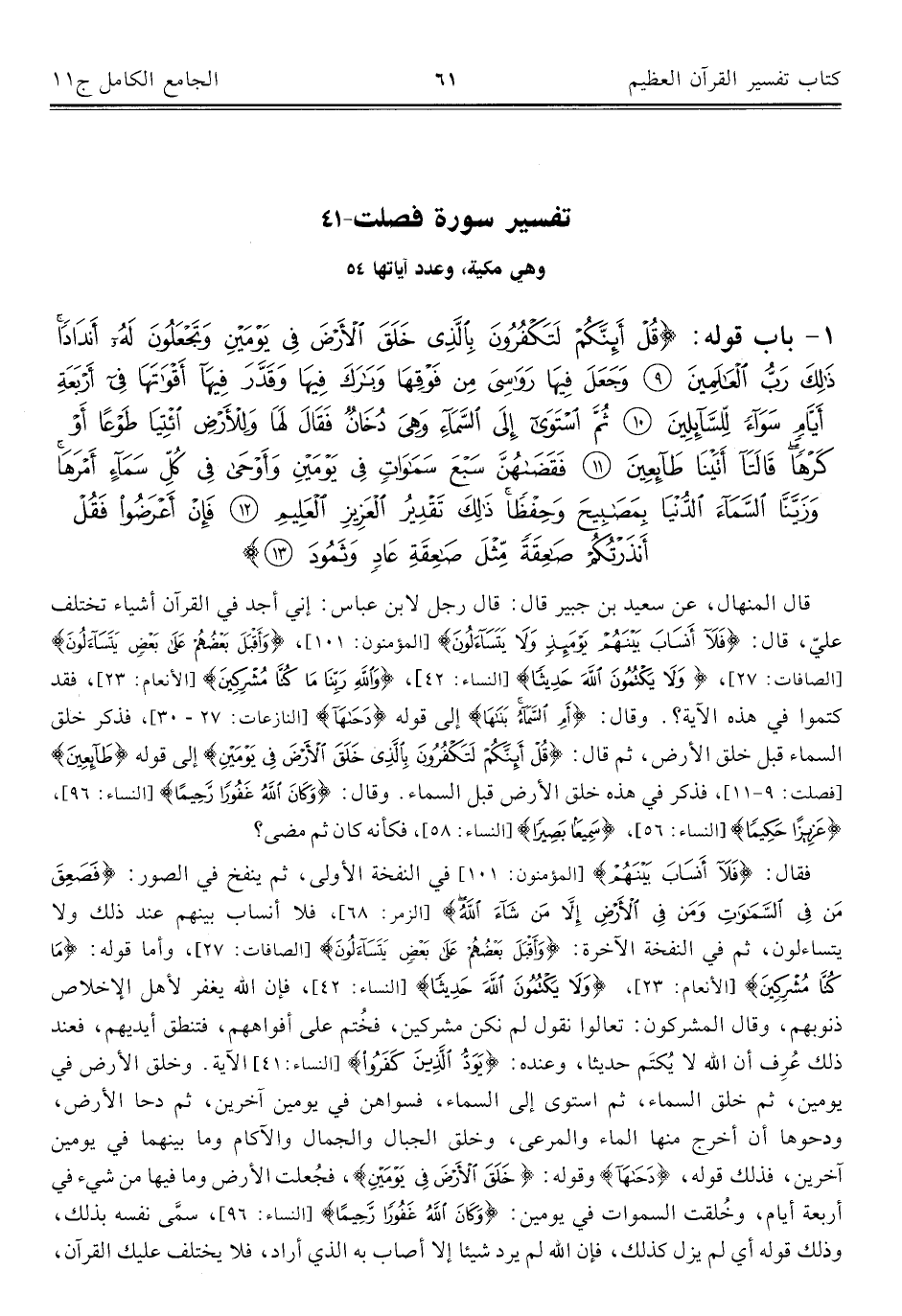 فقال: {فَلَا أَنْسَابَ بَيْنَهُمْ} [المؤمنون: ١٠١] في النفخة الأولى، ثمّ ينفخ في الصّور: {وَنُفِخَ فِي الصُّورِ فَصَعِقَ مَنْ فِي السَّمَاوَاتِ وَمَنْ فِي الْأَرْضِ إِلَّا مَنْ شَاءَ اللَّهُ} [الزمر: ٦٨]، فلا أنساب بينهم عند ذلك ولا يتساءلون، ثمّ في النفخة الآخرة: {وَأَقْبَلَ بَعْضُهُمْ عَلَى بَعْضٍ يَتَسَاءَلُونَ} [الصافات: ٢٧]، وأمّا قوله: {مَا كُنَّا مُشْرِكِينَ} [الأنعام: ٢٣]، {وَلَا يَكْتُمُونَ اللَّهَ حَدِيثًا} [النساء: ٤٢] فإن الله يغفر لأهل الإخلاص ذنوبهم، وقال المشركون: تعالوا نقول لم نكن مشركين، فخُتم على أفواههم، فتنطق أيديهم، فعند ذلك عُرِف أن الله لا يُكتَم حديثًا، وعنده: {يَوَدُّ الَّذِينَ كَفَرُوا} [النساء: ٤٢] الآية. وخلق الأرض في يومين، ثمّ خلق السماء، ثمّ استوى إلى السماء، فسواهن في يومين آخرين، ثمّ دحا الأرض، ودحوها أن أخرج منها الماء والمرعى، وخلق الجبال والجمال والآكام وما بينهما في يومين آخرين، فذلك قوله، {دَحَاهَا} وقوله: {خَلَقَ الْأَرْضَ فِي يَوْمَيْنِ}، فجُعلت الأرض وما فيها من شيء في أربعة أيام، وخُلقت السموات في يومين: {وَكَانَ اللَّهُ غَفُورًا رَحِيمًا} [النساء: ٩٦]، سمَّى نفسه بذلك، وذلك قوله أي لم يزل كذلك، فإن الله لم يرد شيئًا إِلَّا أصاب به الذي أراد، فلا يختلف عليك القرآن،