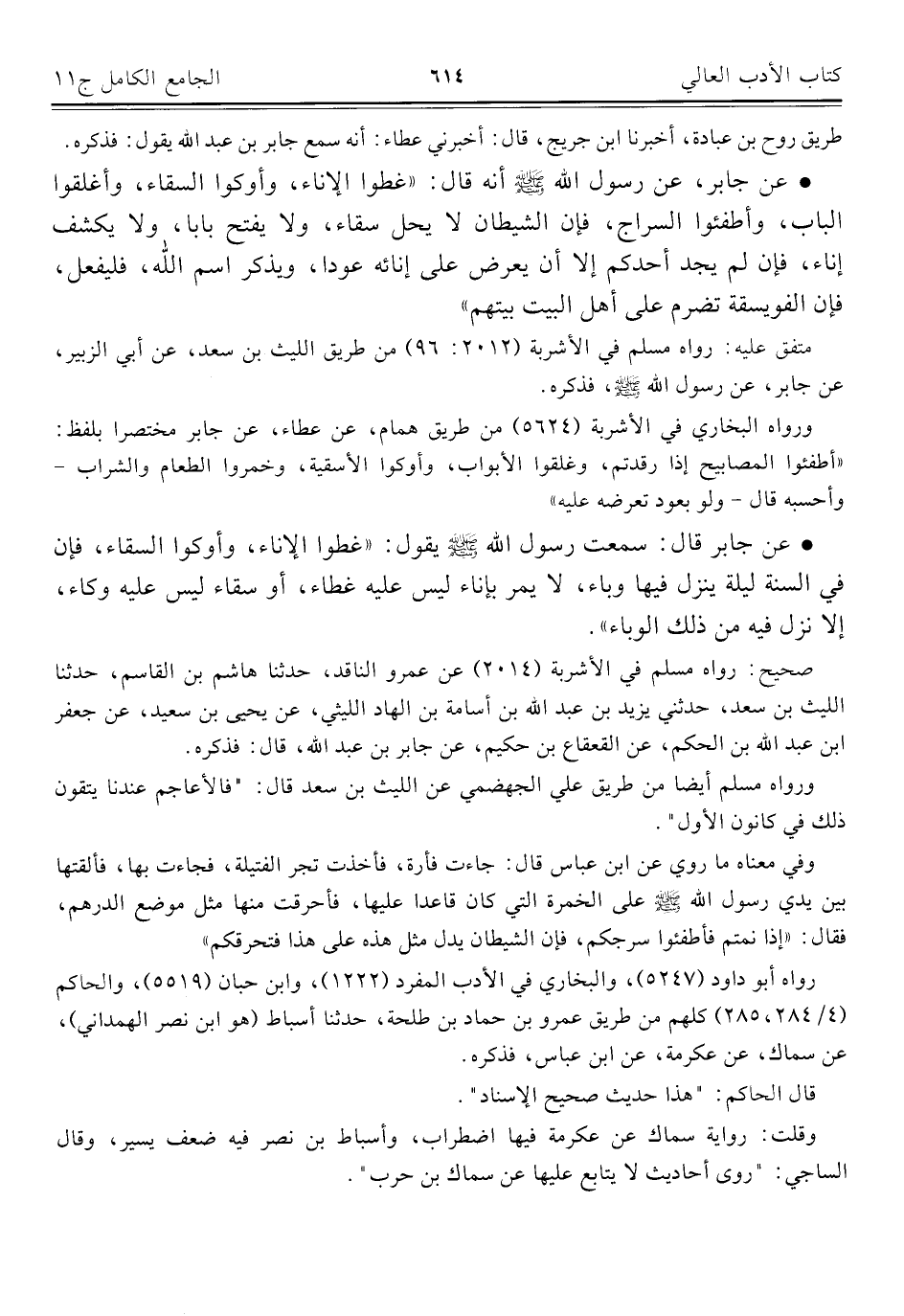 • عن جابر، عن رسول الله - صلى الله عليه وسلم - أنه قال: "غطوا الإناء، وأوكوا السقاء، وأغلقوا الباب، وأطفئوا السراج، فإن الشيطان لا يحل سقاء، ولا يفتح بابا، ولا يكشف إناء، فإن لم يجد أحدكم إلا أن يعرض على إنائه عودا، ويذكر اسم الله، فليفعل، فإن الفويسقة تضرم على أهل البيت بيتهم"