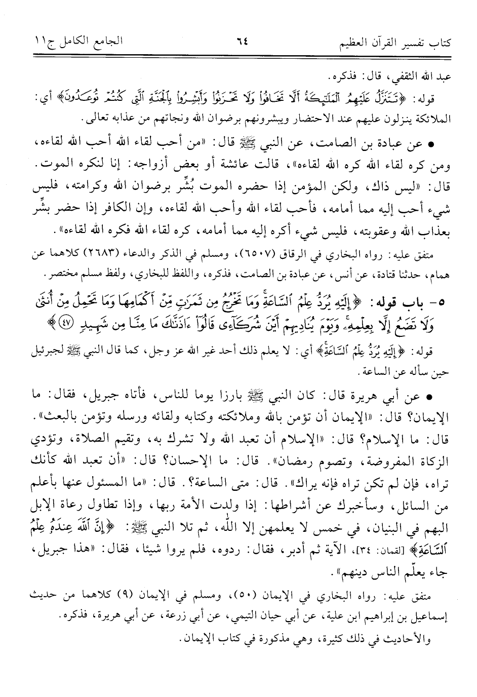 • عن أبي هريرة قال: كان النَّبِيّ - صلى الله عليه وسلم - بارزًا يومًا للناس، فأتاه جبريل، فقال: ما الإيمان؟ قال: "الإيمان أن تؤمن بالله وملائكته وكتابه ولقائه ورسله وتؤمن بالبعث". قال: ما الإسلام؟ قال: "الإسلام أن تعبد الله ولا تشرك به، وتقيم الصّلاة، وتؤدي الزّكاة المفروضة، وتصوم رمضان". قال: ما الإحسان؟ قال: "أن تعبد الله كأنك تراه، فإن لم تكن تراه فإنه يراك". قال: متى الساعة؟ . قال: "ما المسئول عنها بأعلم من السائل، وسأخبرك عن أشراطها: إذا ولدت الأمة ربها، وإذا تطاول رعاة الإبل البهم في البنيان، في خمس لا يعلمهن إِلَّا الله، ثمّ تلا النَّبِيّ - صلى الله عليه وسلم -: {إِنَّ اللَّهَ عِنْدَهُ عِلْمُ السَّاعَةِ)} [لقمان: ٣٤]، الآية ثمّ أدبر، فقال: ردوه، فلم يروا شيئًا، فقال: "هذا جبريل، جاء يعلّم الناس دينهم".