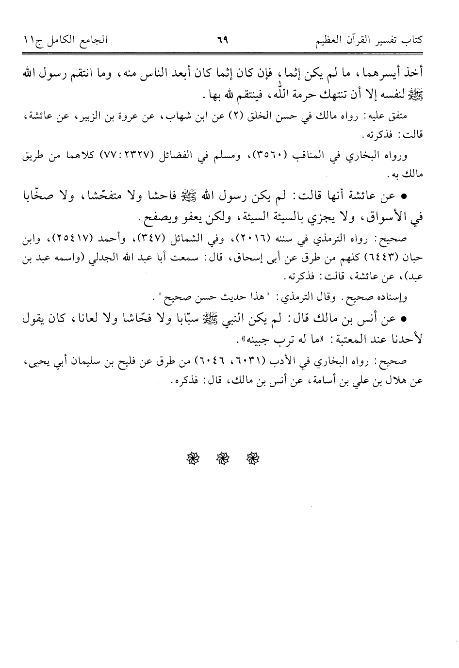 • عن عائشة أنها قالت: لم يكن رسول الله - صلى الله عليه وسلم - فاحشا ولا متفحّشا، ولا صخّابا في الأسواق، ولا يجزي بالسيئة السيئة، ولكن يعفو ويصفح.