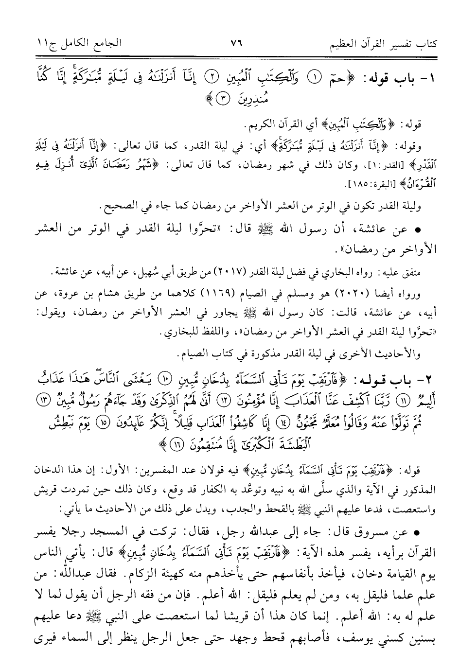 ١ - باب قوله: {حم (١) وَالْكِتَابِ الْمُبِينِ (٢) إِنَّا أَنْزَلْنَاهُ فِي لَيْلَةٍ مُبَارَكَةٍ إِنَّا كُنَّا مُنْذِرِينَ (٣)}