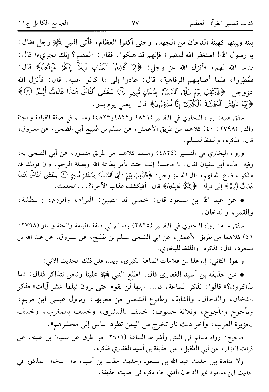 ولا منافاة بين حديث عبد الله بن مسعود وحديث حذيفة بن أسيد، فإن الدخان المذكور في حديث ابن مسعود غير الدخان الذي جاء ذكره في حديث حذيفة.
