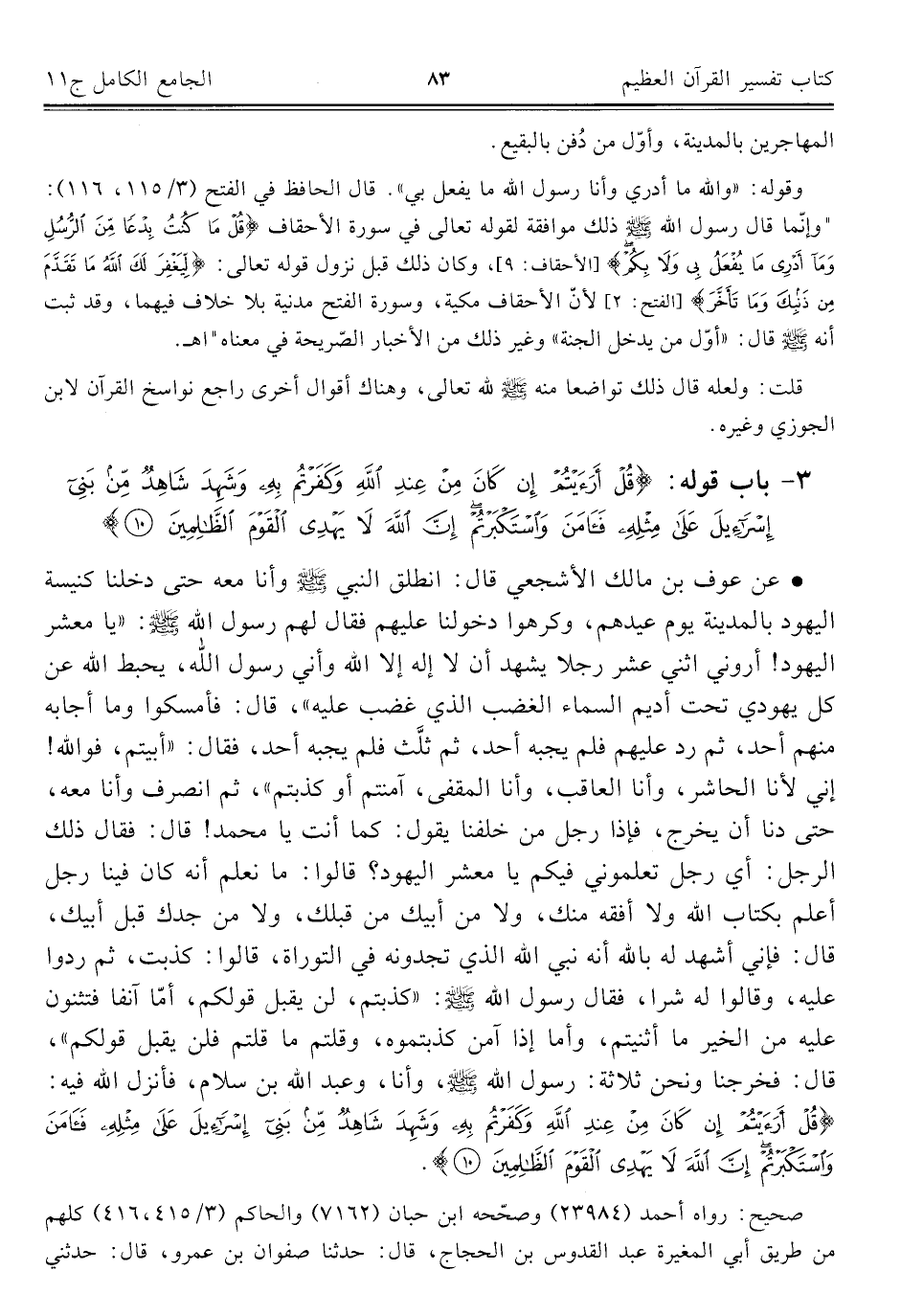 ٣ - باب قوله: {قُلْ أَرَأَيْتُمْ إِنْ كَانَ مِنْ عِنْدِ اللَّهِ وَكَفَرْتُمْ بِهِ وَشَهِدَ شَاهِدٌ مِنْ بَنِي إِسْرَائِيلَ عَلَى مِثْلِهِ فَآمَنَ وَاسْتَكْبَرْتُمْ إِنَّ اللَّهَ لَا يَهْدِي الْقَوْمَ الظَّالِمِينَ (١٠)}