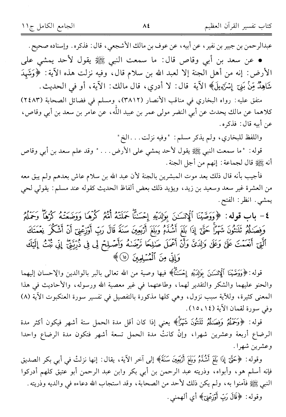 • عن سعد بن أبي وقاص قال: ما سمعت النبي - صلى الله عليه وسلم - يقول لأحد يمشي على الأرض: إنه من أهل الجنة إلا لعبد الله بن سلام قال، وفيه نزلت هذه الآية: {وَشَهِدَ شَاهِدٌ مِنْ بَنِي إِسْرَائِيلَ} الآية قال: لا أدري، قال مالك: الآية، أو في الحديث.