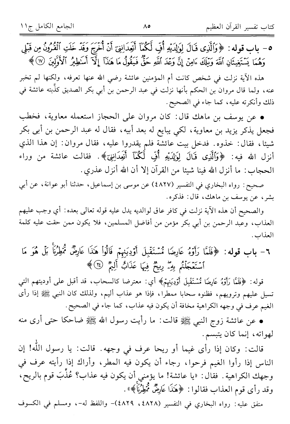 • عن يوسف بن ماهك قال: كان مروان على الحجاز استعمله معاوية، فخطب فجعل يذكر يزيد بن معاوية، لكي يبايع له بعد أبيه، فقال له عبد الرحمن بن أبي بكر شيئا، فقال: خذوه. فدخل بيت عائشة فلم يقدروا عليه، فقال مروان إن هذا الذي أنزل الله فيه: {وَالَّذِي قَالَ لِوَالِدَيْهِ أُفٍّ لَكُمَا أَتَعِدَانِنِي}. فقالت عائشة من وراء الحجاب: ما أنزل الله فينا شيئا من القرآن إلا أن الله أنزل عذري.