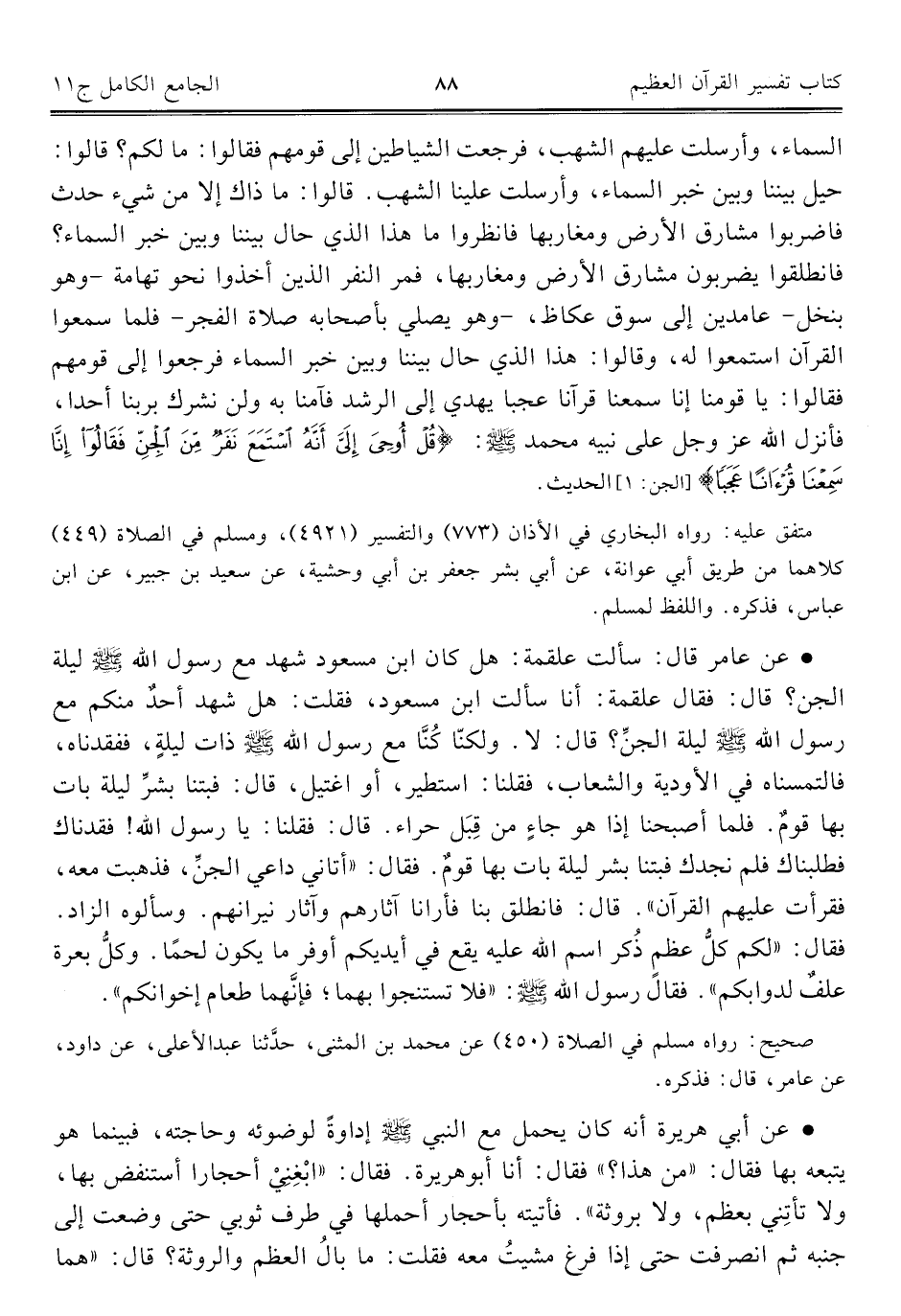 • عن عامر قال: سألت علقمة: هل كان ابن مسعود شهد مع رسول الله - صلى الله عليه وسلم - ليلة الجن؟ قال: فقال علقمة: أنا سألت ابن مسعود، فقلت: هل شهد أحدٌ منكم مع رسول الله - صلى الله عليه وسلم - ليلة الجنِّ؟ قال: لا. ولكنّا كُنَّا مع رسول الله - صلى الله عليه وسلم - ذات ليلةٍ، ففقدناه، فالتمسناه في الأودية والشعاب، فقلنا: استطير، أو اغتيل، قال: فبتنا بشرِّ ليلة بات بها قوم. فلما أصبحنا إذا هو جاءٍ من قِبَل حراء. قال: فقلنا: يا رسول الله! فقدناك فطلبناك فلم نجدك فبتنا بشر ليلة بات بها قومٌ. فقال: "أتاني داعي الجنِّ، فذهبت معه، فقرأت عليهم القرآن". قال: فانطلق بنا فأرانا آثارهم وآثار نيرانهم. وسألوه الزاد. فقال: "لكم كلُّ عظمٍ ذُكر اسم الله عليه يقع في أيديكم أوفر ما يكون لحمًا. وكلُّ بعرة علفٌ لدوابكم". فقال رسول الله - صلى الله عليه وسلم -: "فلا تستنجوا بهما؛ فإنَّهما طعام إخوانكم".