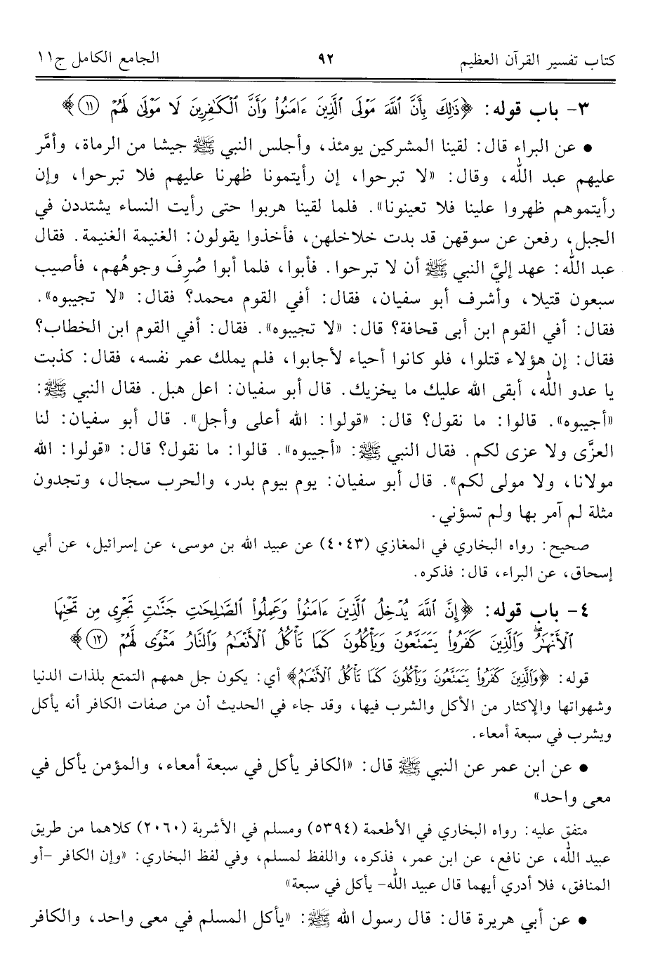 ٣ - باب قوله: {ذَلِكَ بِأَنَّ اللَّهَ مَوْلَى الَّذِينَ آمَنُوا وَأَنَّ الْكَافِرِينَ لَا مَوْلَى لَهُمْ (١١)}