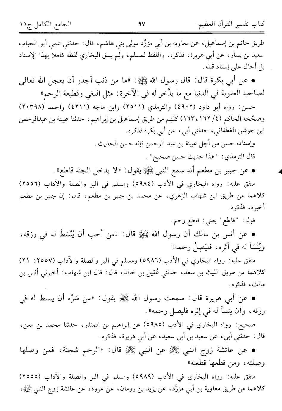 • عن جبير بن مطعم أنه سمع النبي - صلى الله عليه وسلم - يقول: "لا يدخل الجنة قاطع".