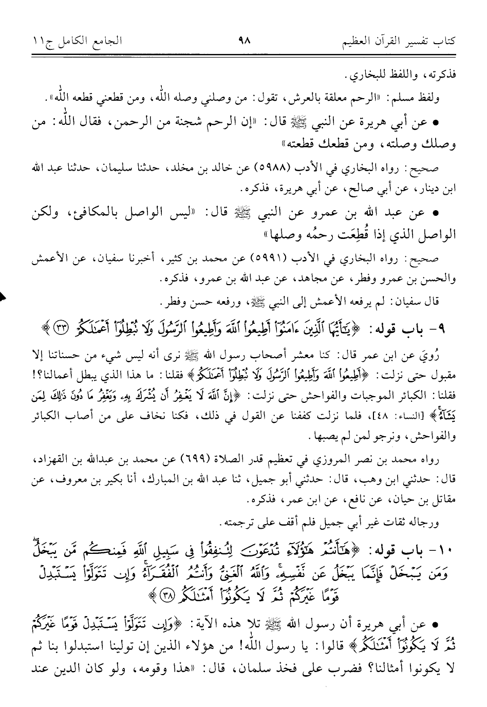 ٩ - باب قوله: {يَاأَيُّهَا الَّذِينَ آمَنُوا أَطِيعُوا اللَّهَ وَأَطِيعُوا الرَّسُولَ وَلَا تُبْطِلُوا أَعْمَالَكُمْ (٣٣)}