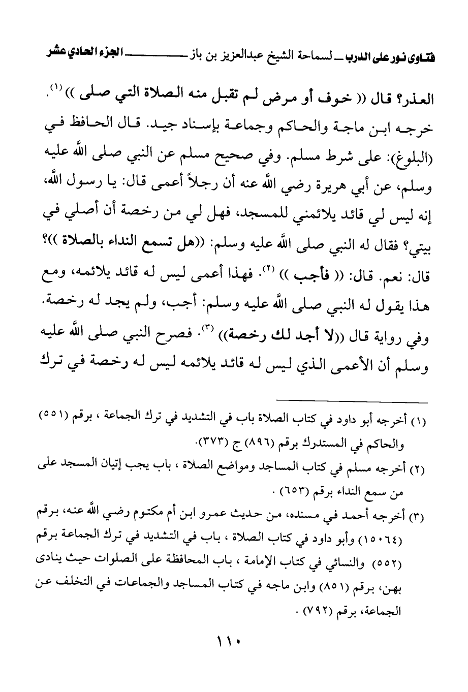 (¬2) أخرجه مسلم في كتاب المساجد ومواضع الصلاة، باب يجب إتيان المسجد على من سمع النداء برقم (653).