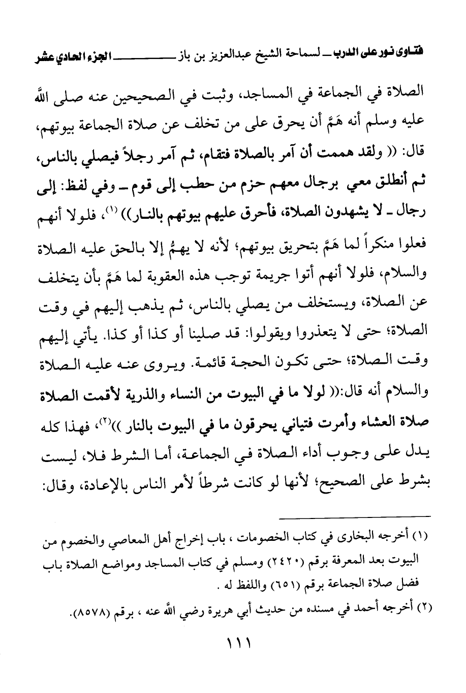 الصلاة في الجماعة في المساجد، وثبت في الصحيحين عنه صلى الله عليه وسلم أنه هم أن يحرق على من تخلف عن صلاة الجماعة بيوتهم، قال: «ولقد هممت أن آمر بالصلاة فتقام، ثم آمر رجلا فيصلي بالناس، ثم أنطلق معي برجال معهم حزم من حطب إلى قوم - وفي لفظ: إلى رجال - لا يشهدون الصلاة، فأحرق عليهم بيوتهم بالنار (¬1)» فلولا أنهم فعلوا منكرا لما هم بتحريق بيوتهم؛ لأنه لا يهم إلا بالحق عليه الصلاة والسلام، فلولا أنهم أتوا جريمة توجب هذه العقوبة لما هم بأن يتخلف عن الصلاة، ويستخلف من يصلي بالناس، ثم يذهب إليهم في وقت الصلاة؛ حتى لا يتعذروا ويقولوا: قد صلينا أو كذا أو كذا. يأتي إليهم وقت الصلاة؛ حتى تكون الحجة قائمة. ويروى عنه عليه الصلاة والسلام أنه قال: «لولا ما في البيوت من النساء والذرية لأقمت الصلاة صلاة العشاء وأمرت فتياني يحرقون ما في البيوت بالنار (¬2)» فهذا كله يدل على وجوب أداء الصلاة في الجماعة، أما الشرط فلا، ليست بشرط على الصحيح؛ لأنها لو كانت شرطا لأمر الناس بالإعادة، وقال: