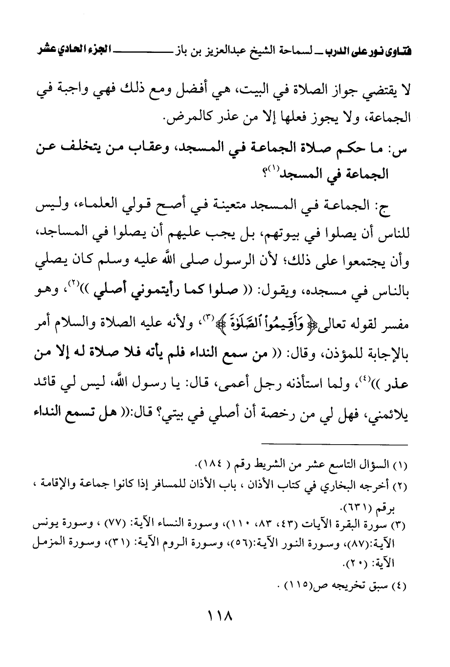 ج: الجماعة في المسجد متعينة في أصح قولي العلماء، وليس للناس أن يصلوا في بيوتهم، بل يجب عليهم أن يصلوا في المساجد، وأن يجتمعوا على ذلك؛ لأن الرسول صلى الله عليه وسلم كان يصلي بالناس في مسجده، ويقول: «صلوا كما رأيتموني أصلي (¬2)» وهو مفسر لقوله تعالى: {وَأَقِيمُوا الصَّلَاةَ} (¬3)، ولأنه عليه الصلاة والسلام أمر بالإجابة للمؤذن، وقال: «من سمع النداء فلم يأته فلا صلاة له إلا من عذر (¬4)» ولما استأذنه رجل أعمى، قال: «يا رسول الله، ليس لي قائد يلائمني، فهل لي من رخصة أن أصلي في بيتي؟ قال: " هل تسمع النداء
