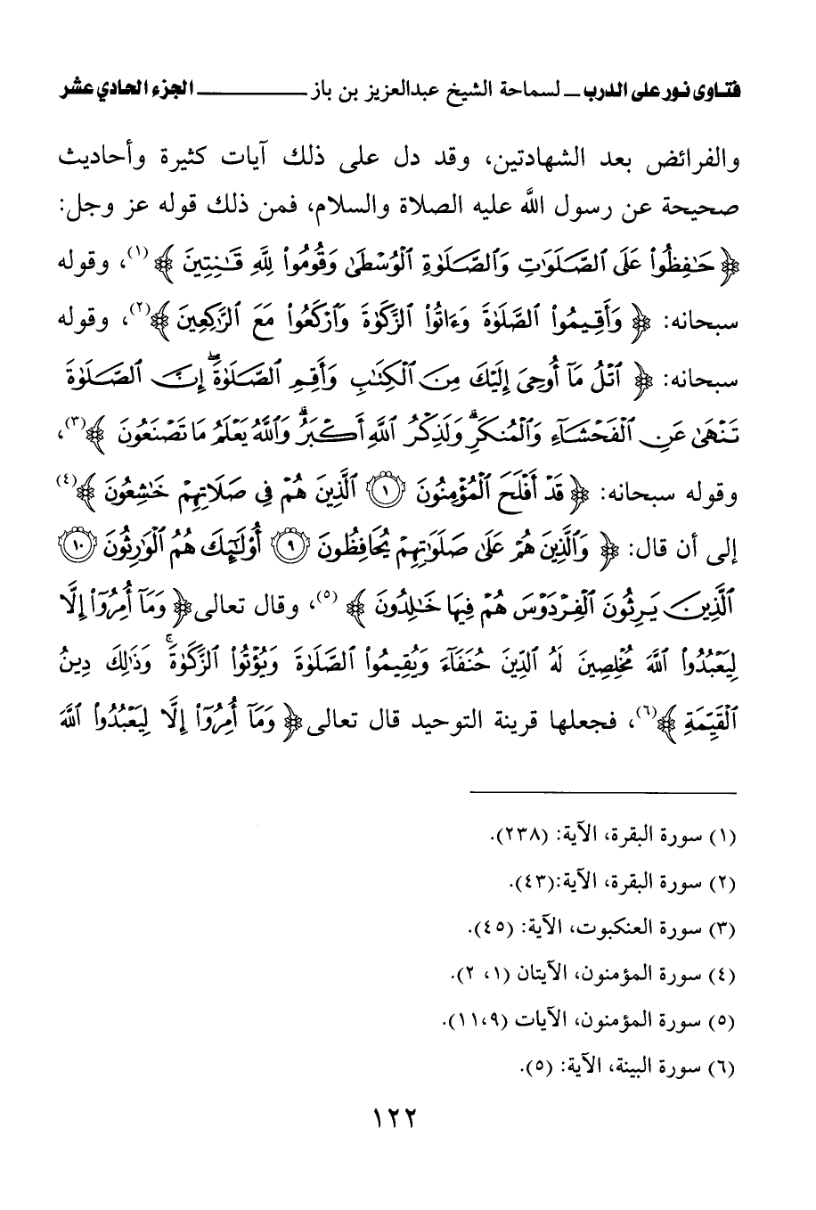 والفرائض بعد الشهادتين، وقد دل على ذلك آيات كثيرة وأحاديث صحيحة عن رسول الله عليه الصلاة والسلام، فمن ذلك قوله عز وجل: {حَافِظُوا عَلَى الصَّلَوَاتِ وَالصَّلَاةِ الْوُسْطَى وَقُومُوا لِلَّهِ قَانِتِينَ} (¬1)، وقوله سبحانه: {وَأَقِيمُوا الصَّلَاةَ وَآتُوا الزَّكَاةَ وَارْكَعُوا مَعَ الرَّاكِعِينَ} (¬2)، وقوله سبحانه: {اتْلُ مَا أُوحِيَ إِلَيْكَ مِنَ الْكِتَابِ وَأَقِمِ الصَّلَاةَ إِنَّ الصَّلَاةَ تَنْهَى عَنِ الْفَحْشَاءِ وَالْمُنْكَرِ وَلَذِكْرُ اللَّهِ أَكْبَرُ وَاللَّهُ يَعْلَمُ مَا تَصْنَعُونَ} (¬3)، وقوله سبحانه: {قَدْ أَفْلَحَ الْمُؤْمِنُونَ} (¬4) {الَّذِينَ هُمْ فِي صَلَاتِهِمْ خَاشِعُونَ} (¬5) إلى أن قال: {وَالَّذِينَ هُمْ عَلَى صَلَوَاتِهِمْ يُحَافِظُونَ} (¬6) {أُولَئِكَ هُمُ الْوَارِثُونَ} (¬7) {الَّذِينَ يَرِثُونَ الْفِرْدَوْسَ هُمْ فِيهَا خَالِدُونَ} (¬8)، وقال تعالى: {وَمَا أُمِرُوا إِلَّا لِيَعْبُدُوا اللَّهَ مُخْلِصِينَ لَهُ الدِّينَ حُنَفَاءَ وَيُقِيمُوا الصَّلَاةَ وَيُؤْتُوا الزَّكَاةَ وَذَلِكَ دِينُ الْقَيِّمَةِ} (¬9)، فجعلها قرينة التوحيد قال تعالى: {وَمَا أُمِرُوا إِلَّا لِيَعْبُدُوا اللَّهَ مُخْلِصِينَ} (¬10)