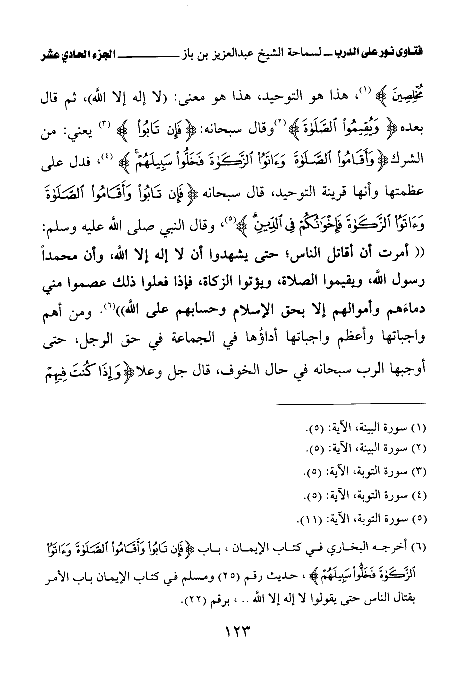 هذا هو التوحيد، هذا هو معنى: (لا إله إلا الله)، ثم قال بعده {وَيُقِيمُوا الصَّلَاةَ} (¬1) وقال سبحانه: {فَإِنْ تَابُوا} (¬2) يعني: من الشرك {وَأَقَامُوا الصَّلَاةَ وَآتَوُا الزَّكَاةَ فَخَلُّوا سَبِيلَهُمْ} (¬3)، فدل على عظمتها وأنها قرينة التوحيد، قال سبحانه {فَإِنْ تَابُوا وَأَقَامُوا الصَّلَاةَ وَآتَوُا الزَّكَاةَ فَإِخْوَانُكُمْ فِي الدِّينِ} (¬4)، وقال النبي صلى الله عليه وسلم: «أمرت أن أقاتل الناس؛ حتى يشهدوا أن لا إله إلا الله، وأن محمدا رسول الله، ويقيموا الصلاة، ويؤتوا الزكاة، فإذا فعلوا ذلك عصموا مني دماءهم وأموالهم إلا بحق الإسلام وحسابهم على الله (¬5)» ومن أهم واجباتها وأعظم واجباتها أداؤها في الجماعة في حق الرجل، حتى أوجبها الرب سبحانه في حال الخوف، قال جل وعلا
