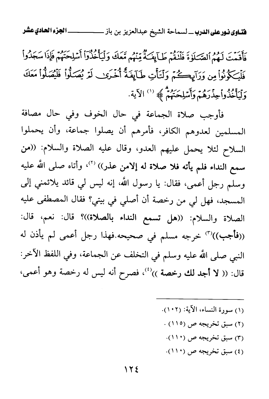 فأوجب صلاة الجماعة في حال الخوف وفي حال مصافة المسلمين لعدوهم الكافر، فأمرهم أن يصلوا جماعة، وأن يحملوا السلاح لئلا يحمل عليهم العدو، وقال عليه الصلاة والسلام: «من سمع النداء فلم يأته فلا صلاة له إلا من عذر (¬2)» وأتاه صلى الله عليه وسلم رجل أعمى، فقال: «يا رسول الله، إنه ليس لي قائد يلائمني إلى المسجد، فهل لي من رخصة أن أصلي في بيتي؟ فقال المصطفى عليه الصلاة والسلام: " هل تسمع النداء بالصلاة "؟ قال: نعم، قال: " فأجب (¬3)» خرجه مسلم في صحيحه. فهذا رجل أعمى لم يأذن له النبي صلى الله عليه وسلم في التخلف عن الجماعة، وفي اللفظ الآخر: قال: «لا أجد لك رخصة (¬4)» فصرح أنه ليس له رخصة وهو أعمى،