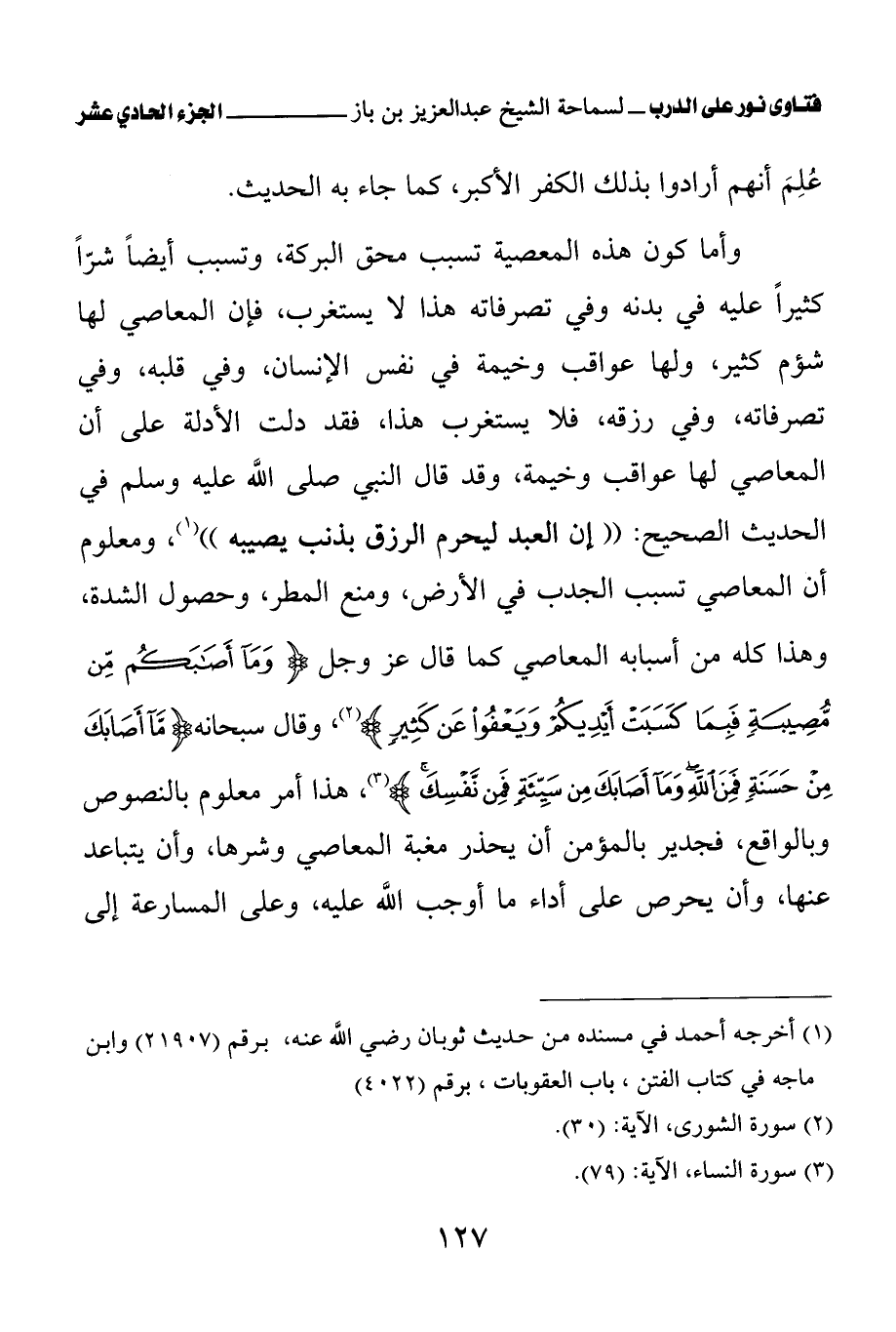 وأما كون هذه المعصية تسبب محق البركة، وتسبب أيضا شرا كثيرا عليه في بدنه وفي تصرفاته هذا لا يستغرب، فإن المعاصي لها شؤم كثير، ولها عواقب وخيمة في نفس الإنسان، وفي قلبه، وفي تصرفاته، وفي رزقه، فلا يستغرب هذا، فقد دلت الأدلة على أن المعاصي لها عواقب وخيمة، وقد قال النبي صلى الله عليه وسلم في الحديث الصحيح: «إن العبد ليحرم الرزق بذنب يصيبه (¬1)» ومعلوم أن المعاصي تسبب الجدب في الأرض، ومنع المطر، وحصول الشدة، وهذا كله من أسبابه المعاصي كما قال عز وجل {وَمَا أَصَابَكُمْ مِنْ مُصِيبَةٍ فَبِمَا كَسَبَتْ أَيْدِيكُمْ وَيَعْفُو عَنْ كَثِيرٍ} (¬2)، وقال سبحانه {مَا أَصَابَكَ مِنْ حَسَنَةٍ فَمِنَ اللَّهِ وَمَا أَصَابَكَ مِنْ سَيِّئَةٍ فَمِنْ نَفْسِكَ} (¬3)، هذا أمر معلوم بالنصوص وبالواقع، فجدير بالمؤمن أن يحذر مغبة المعاصي وشرها، وأن يتباعد عنها، وأن يحرص على أداء ما أوجب الله عليه، وعلى المسارعة إلى