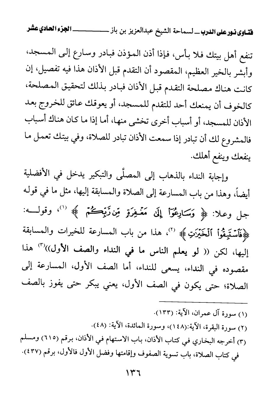 وإجابة النداء بالذهاب إلى المصلى والتبكير يدخل في الأفضلية أيضا، وهذا من باب المسارعة إلى الصلاة والمسابقة إليها، مثل ما في قول-هـ ج-ل وع-لا: {وَسَارِعُوا إِلَى مَغْفِرَةٍ مِنْ رَبِّكُمْ} (¬1)، وقوله: {فَاسْتَبِقُوا الْخَيْرَاتِ} (¬2)، هذا من باب المسارعة للخيرات والمسابقة إليها، لكن «لو يعلم الناس ما في النداء والصف الأول (¬3)» هذا مقصوده في النداء، يسعى للنداء، أما الصف الأول، المسارعة إلى الصلاة؛ حتى يكون في الصف الأول، يعني يبكر حتى يفوز بالصف